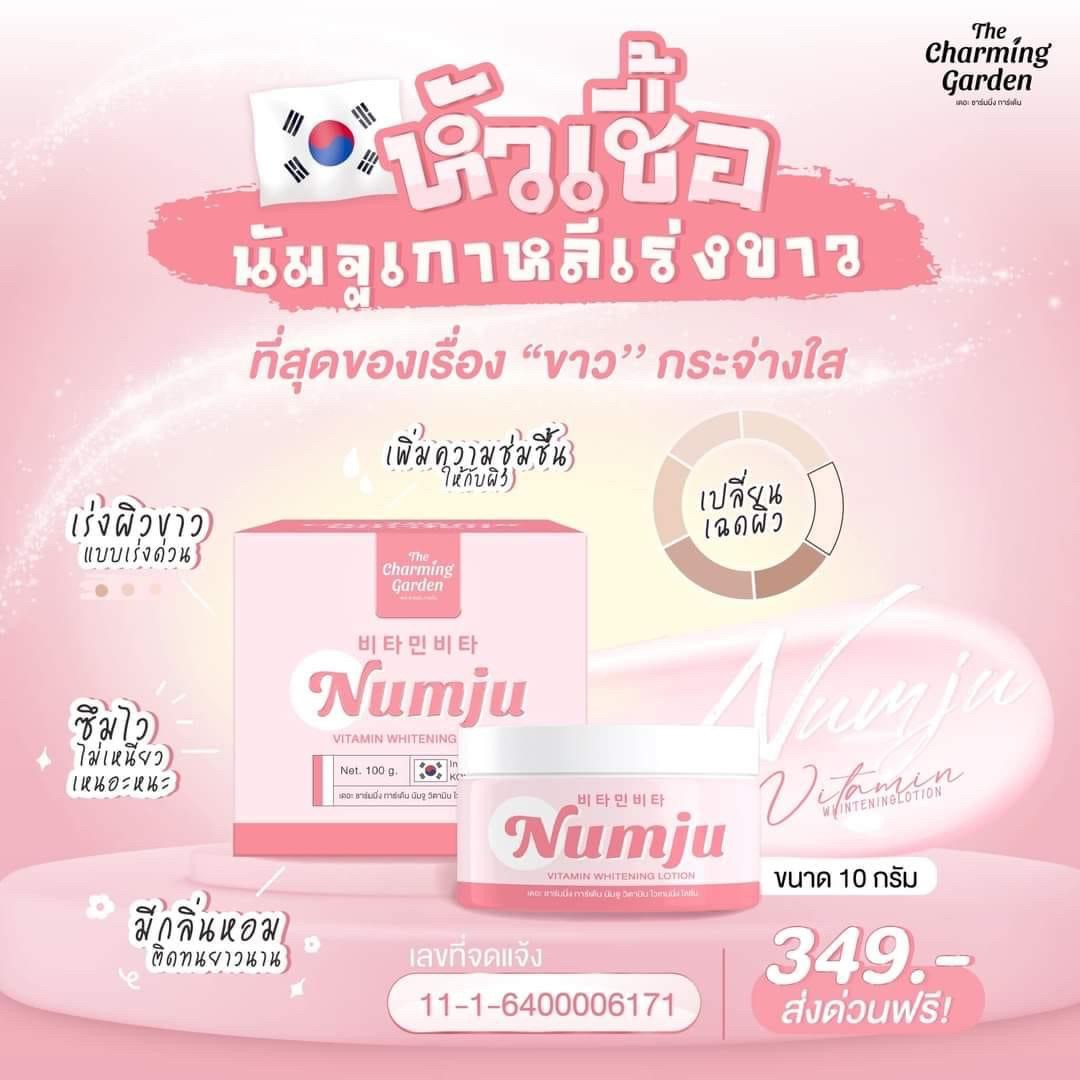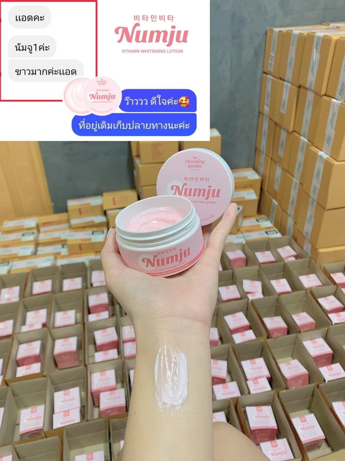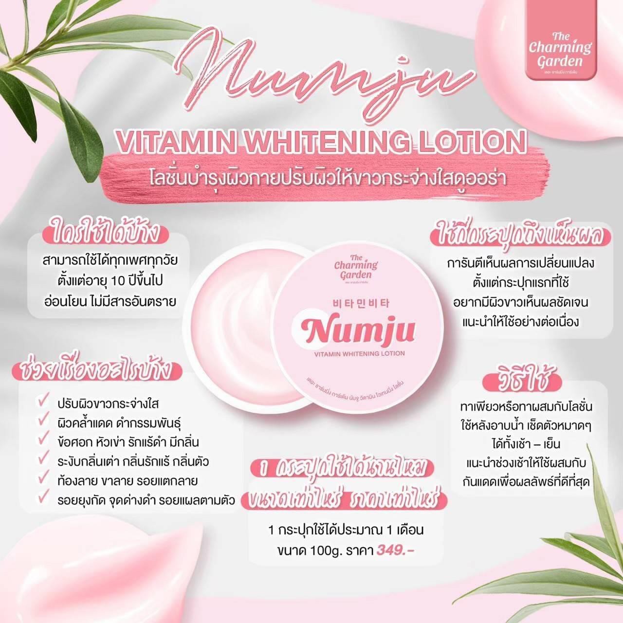 VITAMIN WHITENING LOTION Numju นัมจู โลชั่นวิตามินเกาหลี บำรุงล้ำลึก ปรับสภาพผิวกายให้ขาวกระจ่างใส เรียบเนียนดูเป็นธรรมชาติ ด้วยโลชั่นวิตามินผิว เข้มข้น กว่าโลชั่นทั่วไปถึง 3 เท่า 1 กระปุก ขนาด 100 กรัม |