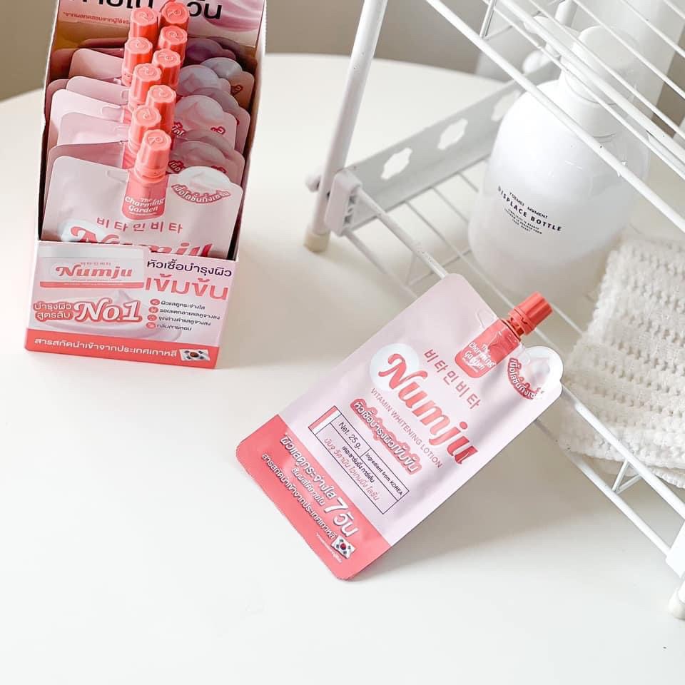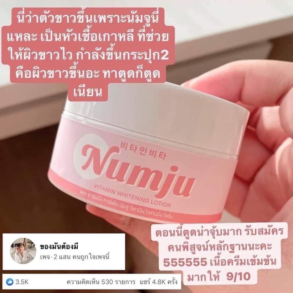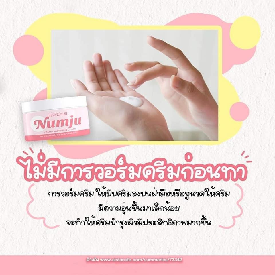 VITAMIN WHITENING LOTION Numju นัมจู โลชั่นวิตามินเกาหลี บำรุงล้ำลึก ปรับสภาพผิวกายให้ขาวกระจ่างใส เรียบเนียนดูเป็นธรรมชาติ ด้วยโลชั่นวิตามินผิว เข้มข้น กว่าโลชั่นทั่วไปถึง 3 เท่า 1 กระปุก ขนาด 100 กรัม |