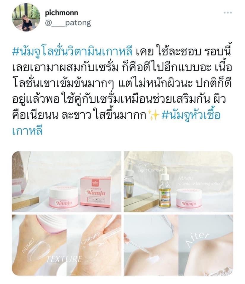 เห็นรีวิวเยอะมาก ที่เอามาทาเพียวๆ ข้างหนึ่งสรุปผิวขาวขึ้นจริง ใครกลัวเปลืองทาผสมโลชั่นทั่วไปได้ ผิวใสเหมือนกัน ถ้าอยากเร่งหน่อยก็เพียวๆไปเลย หมดไป 5-6 ปุกแล้ว เริ่ด หัวเชื้อนัมจู เกาหลี 9.5/10 รีวิวจาก Facebook Fanpage มนุษย์ Drugstore |