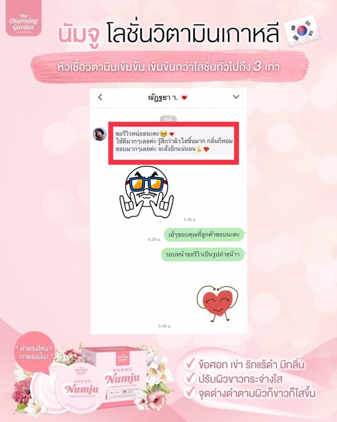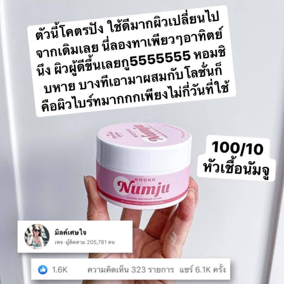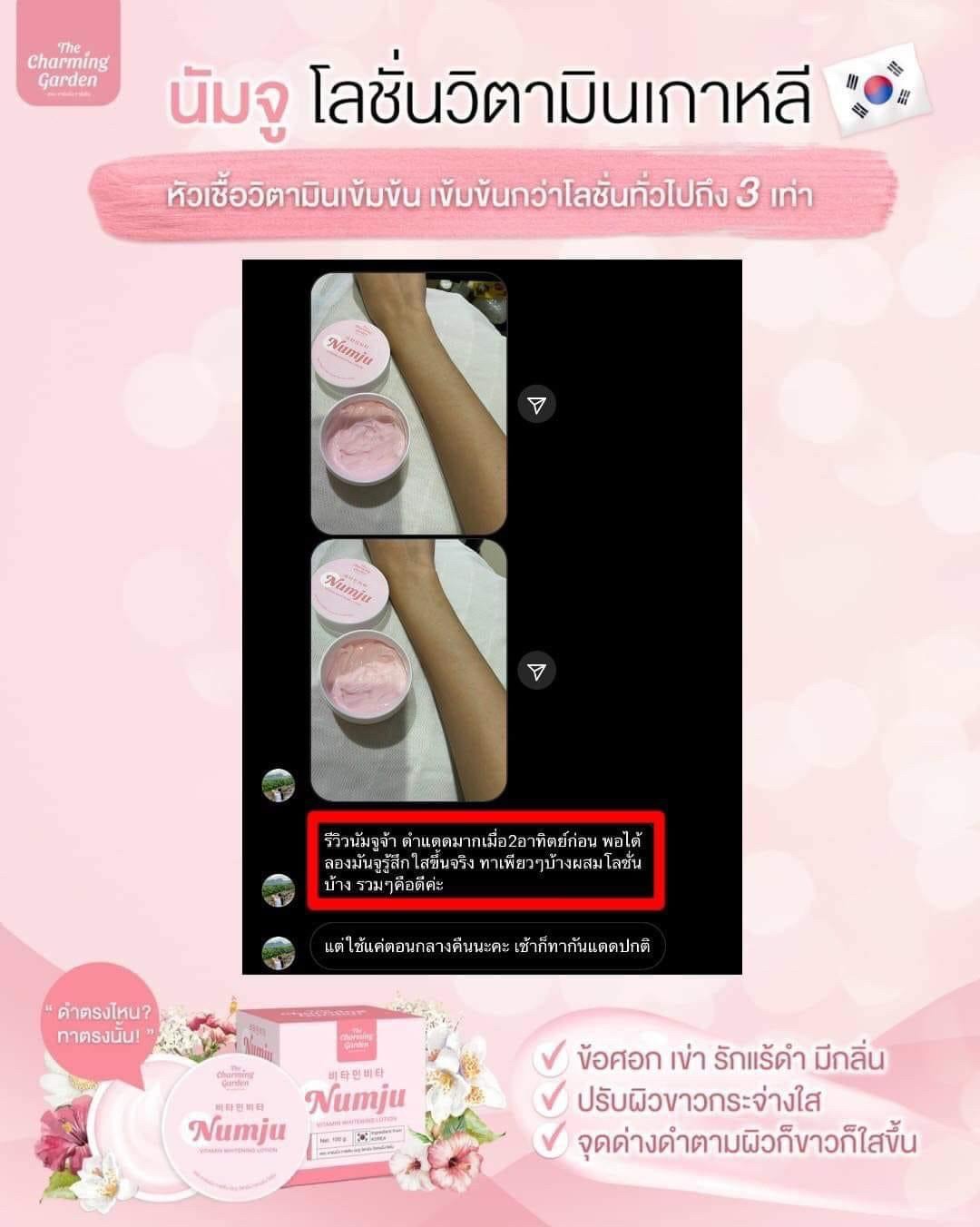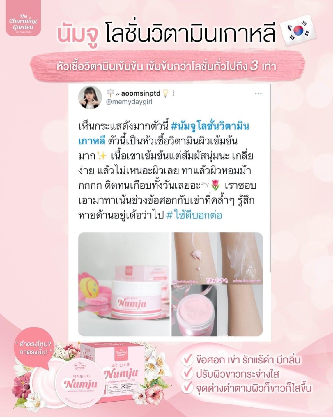 นัมจู Numju โลชั่นวิตามินเกาหลีให้อะไรผิว ผิวจึงถึงดูขาว ออร่าแบบสะดุดตา ✅ ปรับระดับผิวขาวใสอย่างต่อเนื่อง แม้ผิวคล้ำมาก ให้ดูเปล่งปลั่งเรียบเนียนกว่าที่เคย ✅ เห็นผลเร็วกว่าโลชั่นทั่วไป เห็นผลใน 7 วัน เคสที่เปลี่ยนแปลงเร็วสุด ✅ กลิ่นหอมติดทนนาน ทาง่าย ซึมไว ไม่ติดขน ✅ บำรุงผิวให้ชุ่มชื่น ไม่แห้งกร้าน ช่วยในการผลัดเซลล์ผิว ✅ แก้ปัญหาได้ตรงจุดรอยแตกลาย หัวเข่าดำศอกดำ รักแร้ดำ |