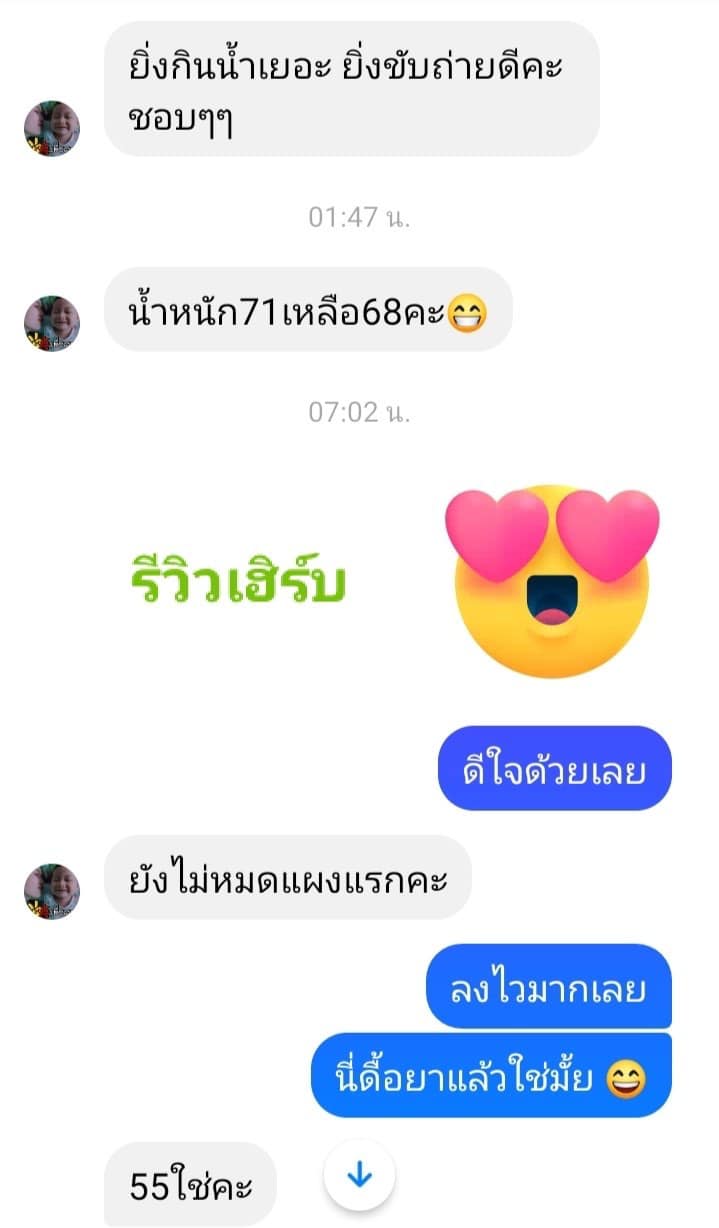 ยิ่งกินน้ำเยอะ ยิ่งขับถ่ายดีค่ะ ชอบๆ น้ำหนัก 71 เหลือ 68 ค่ะ ขนาดยังไม่หมดแผงแรกเลยนะคะ |