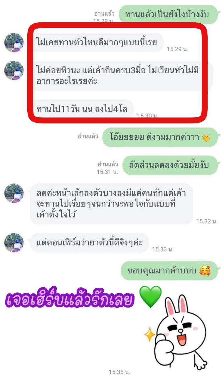 ไม่เคยทานตัวไหนดีมากๆแบบนี้เลย ไม่ค่อยหิวนะ แต่เค้ากินครบ 3 มื้อ ไม่เวียนหัว ไม่มีอาการอะไรเลยค่ะ ทานไป 11 วัน นน. ลงไป 4 โล สัดส่วนลดไปด้วยค่ะ หน้าเล็กลง ตัวบางลง มีแต่คนทัก แต่เค้าว่าจะทานไปเรื่อยๆ จนกว่าจะพอใจกับแบบที่เค้าตั้งใจไว้ แต่คอนเฟิร์มว่ายาตัวนี้ดีจริงๆค่ะ |