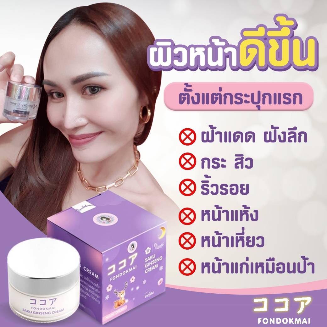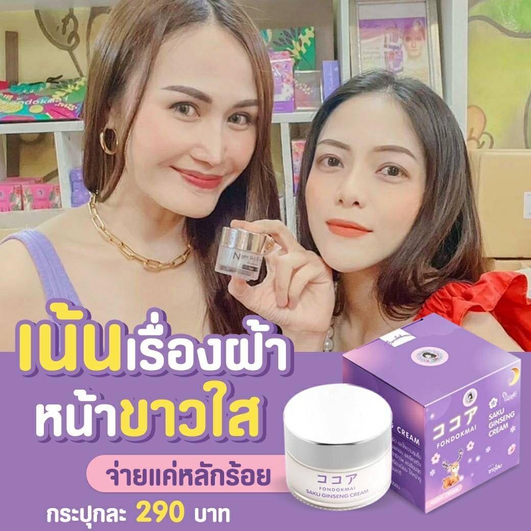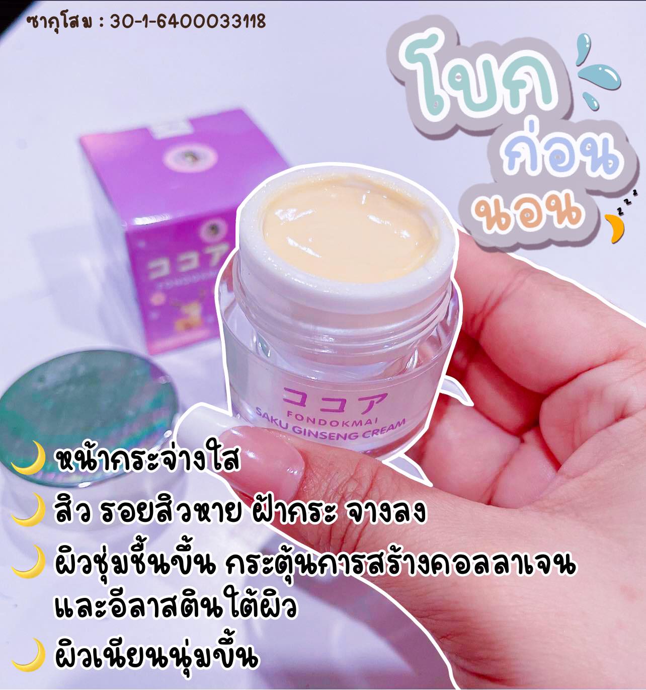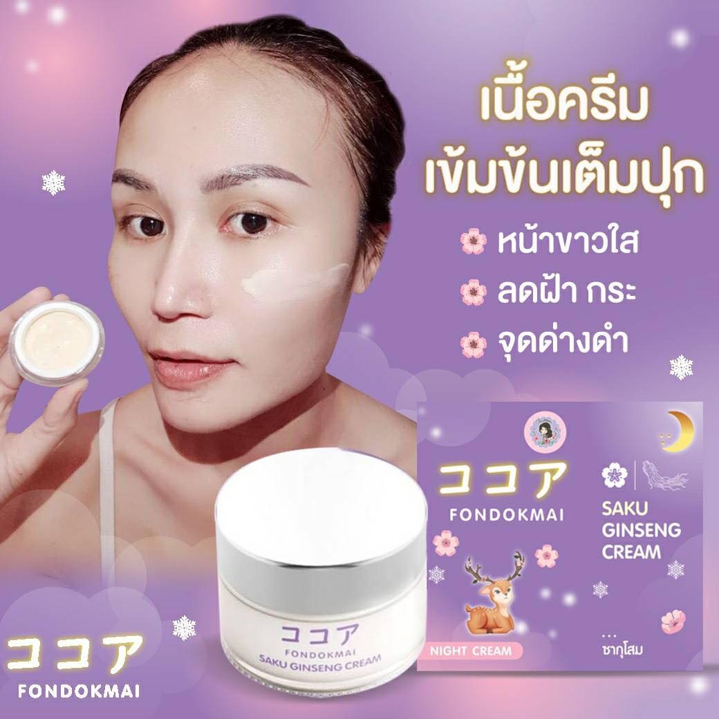 ฝ้า กระ จุดด่างดำ เป็นสิว หน้าดำคล้ำ ทาครีมก่อนนอนทุกคืน เห็นผลใน 7 วัน หน้าขาวใส สิวหาย ฝ้าจางลง วิธีใช้ ทาเฉพาะกลางคืนก่อนนอนเท่านั้น FONDOKMAI SAKU GINSENG CREAM |