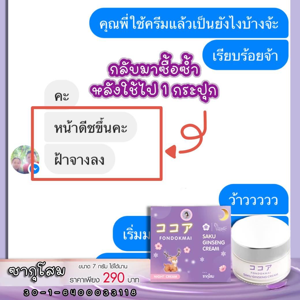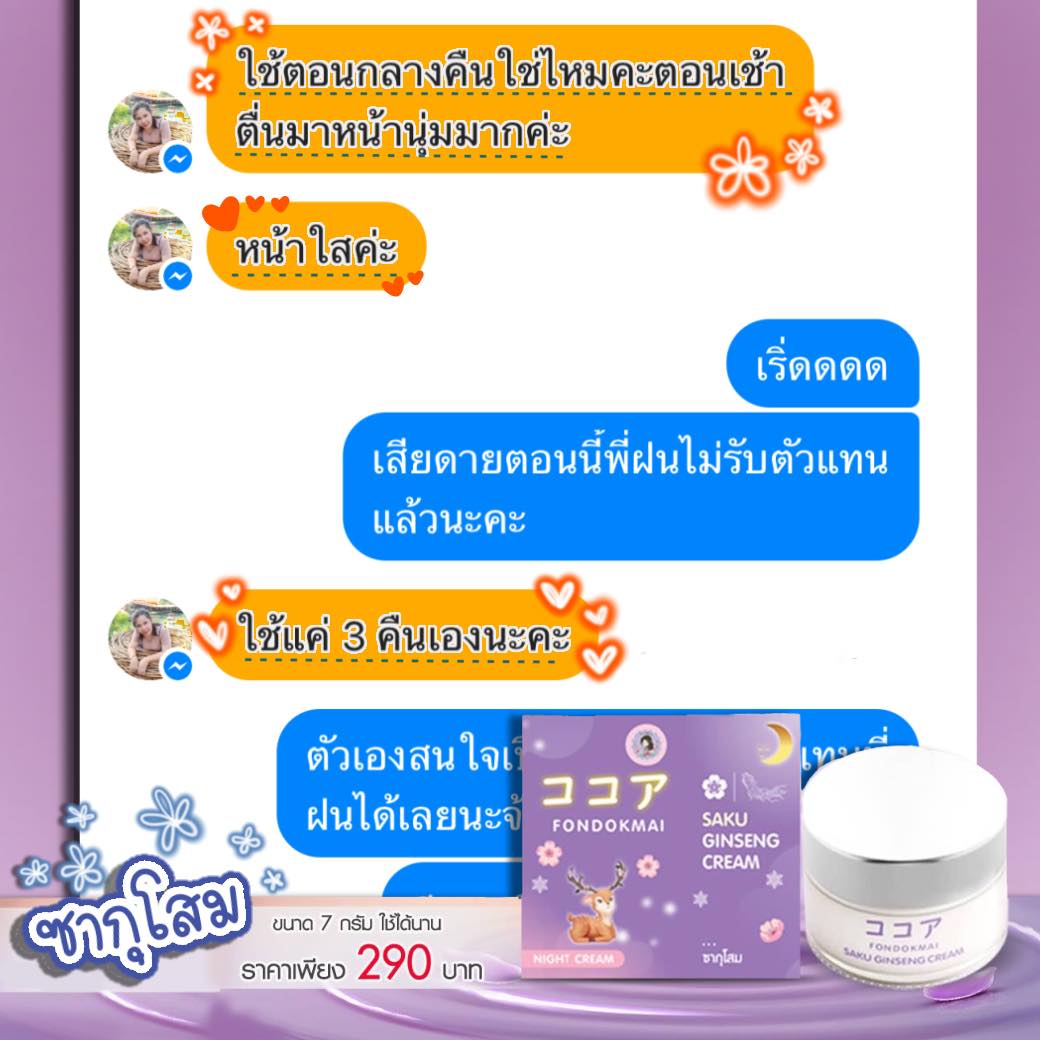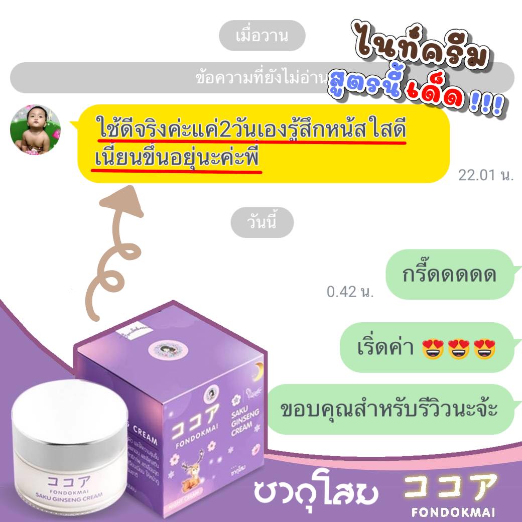 ใช้ตอนกลางคืนใช่ไหมคะตอนเช้า ตื่นมาหน้านุ่มมากค่ะ หน้าใสค่ะ ใช้แค่ 3 คืนเองนะคะ FONDOKMAI SAKU GINSENG CREAM |