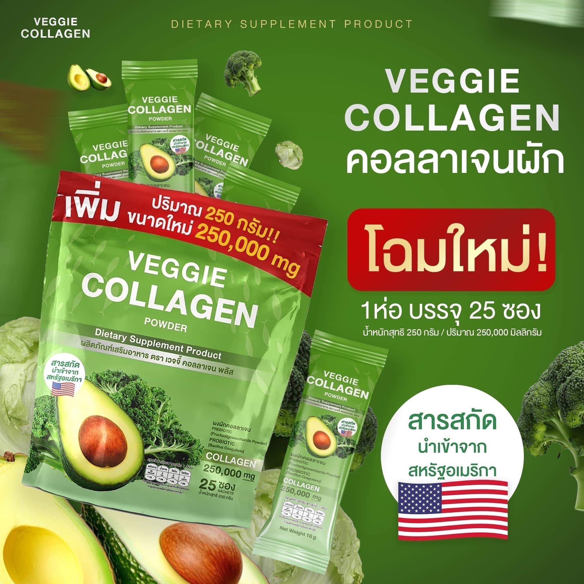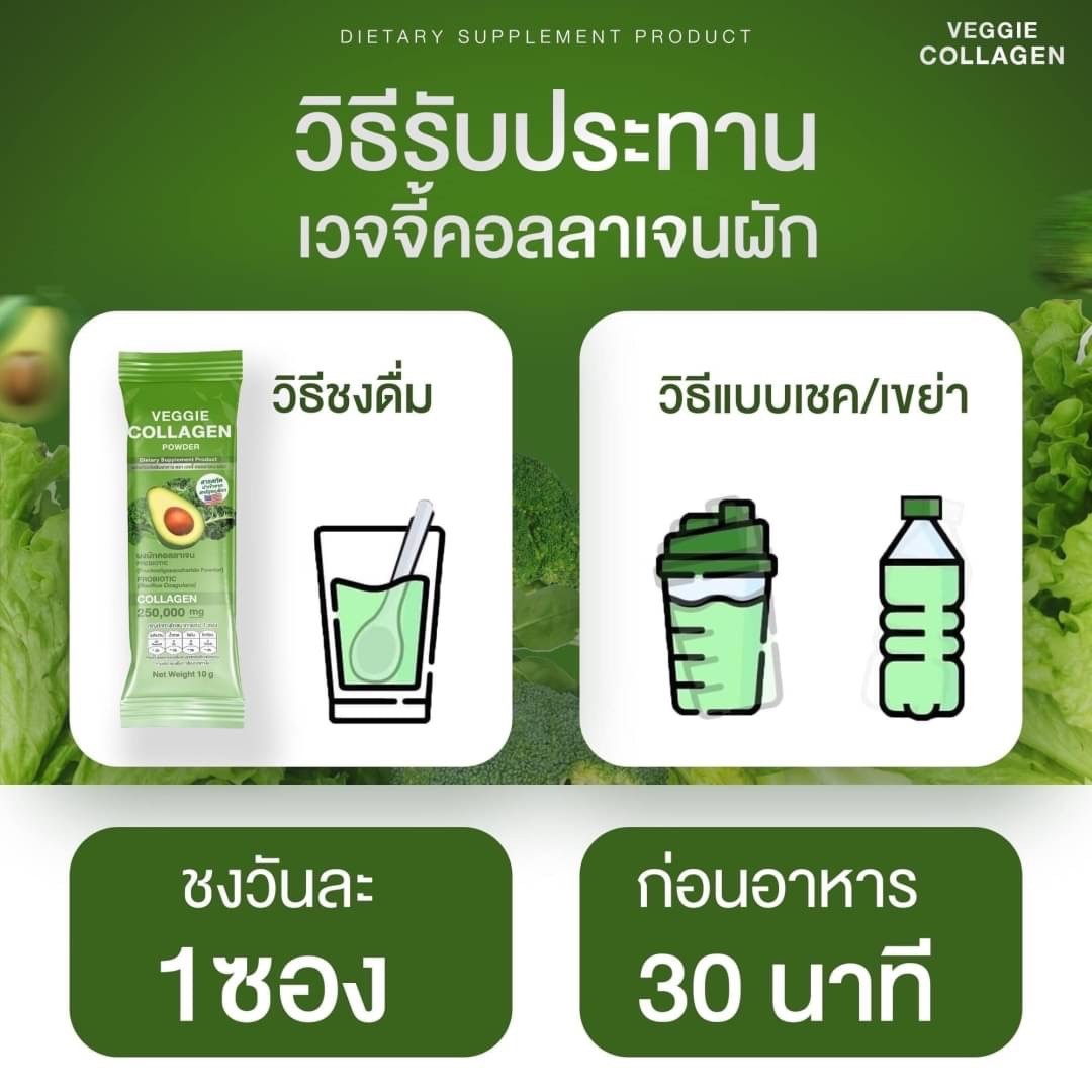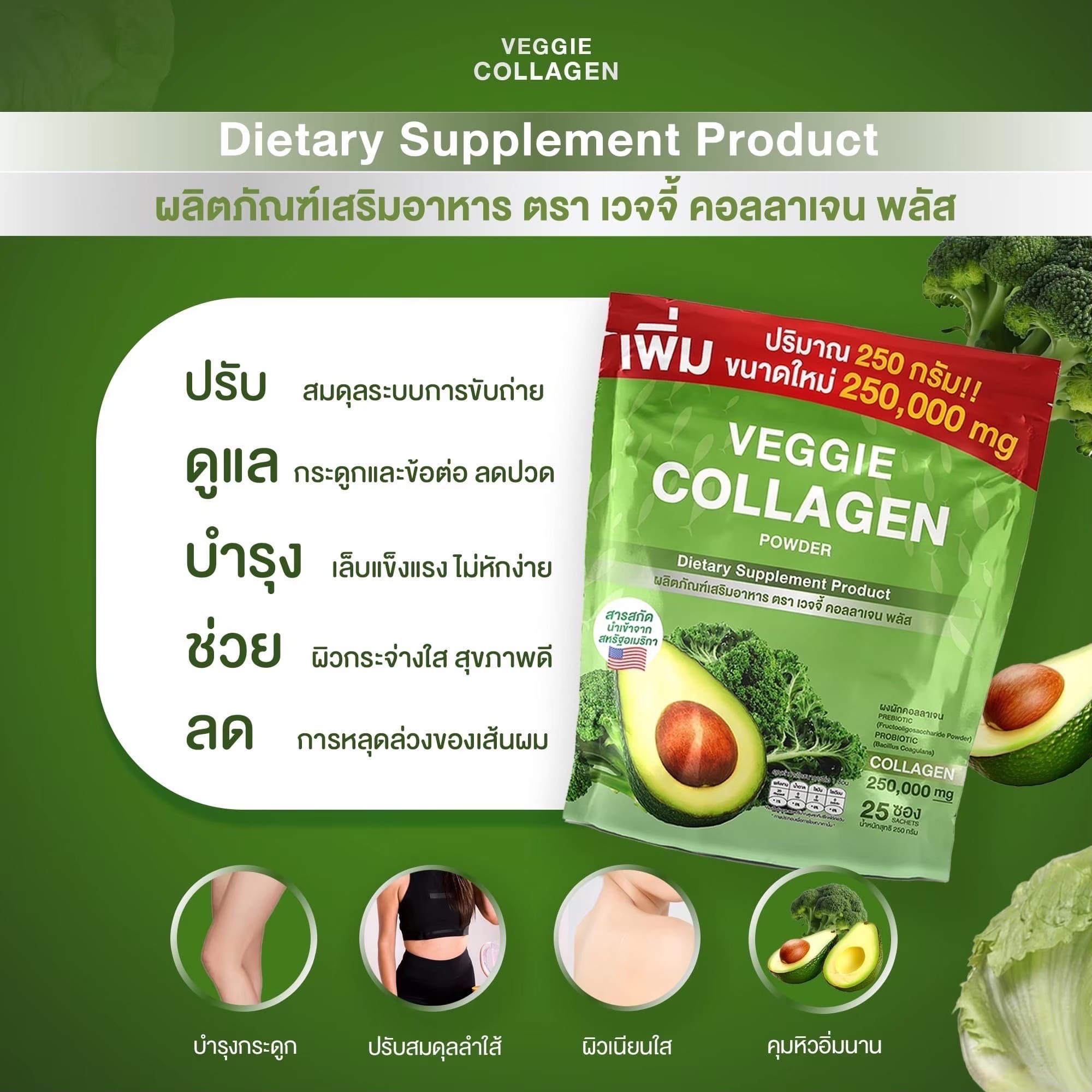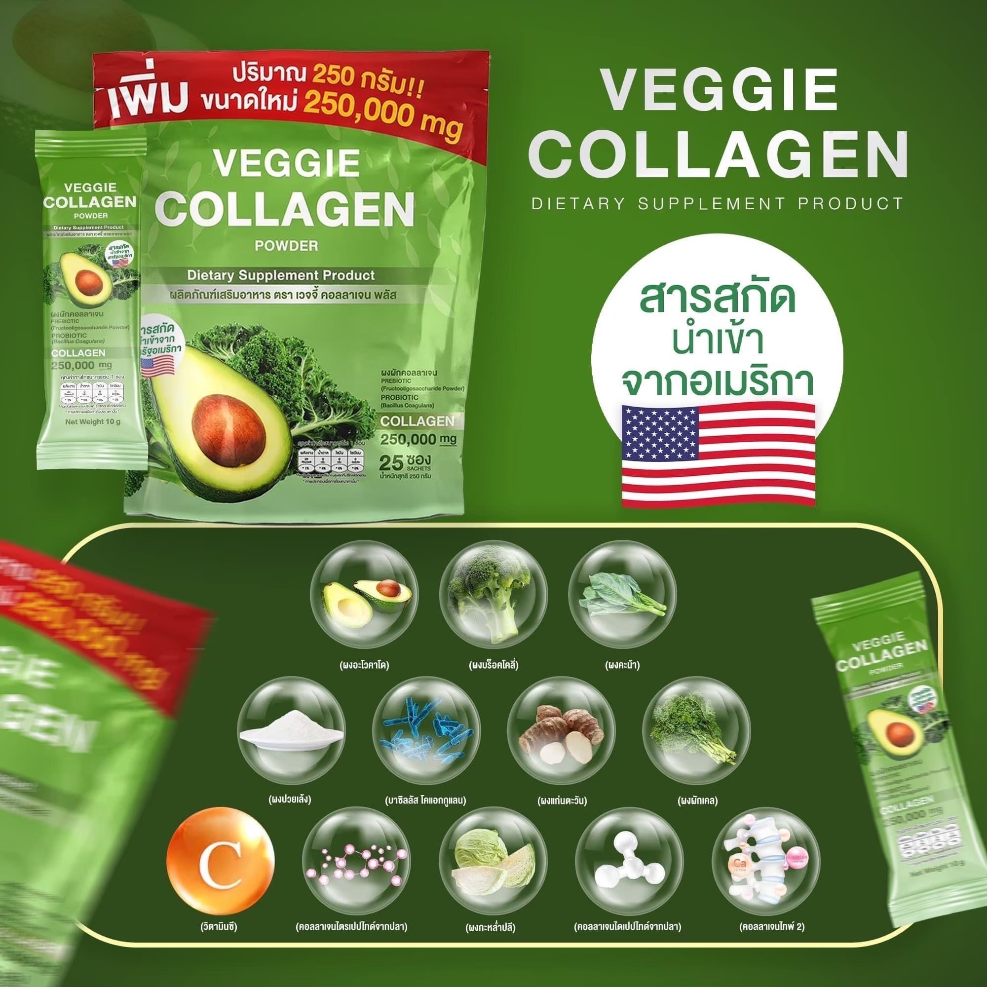 Veggie collagen คอลลาเจนผัก เวจจี้ คอลลาเจน บำรุงครบ ผิว เล็บ ผม กระดูก ดื่มง่าย ไม่คาว ปลอดภัย 100% คอลลาเจนเกรดพรีเมี่ยม ดูดซึมง่าย ไม่มีน้ำตาล ไม่อ้วน บำรุงผิว ปรับสมดุลการขับถ่าย สารสกัดนำเข้าจากสหรัฐอเมริกา |