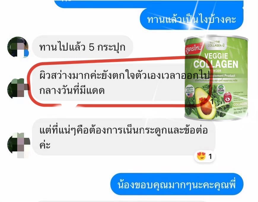 ทานเวจจี้คอลลาเจน ไปแล้ว 5 กระปุก ผิวสว่างมากค่ะ ยังตกใจตัวเองเวลาออกไปกลางวันที่มีแดด แต่ที่แน่ๆ คือต้องการเน้นกระดูกและข้อต่อค่ะ |