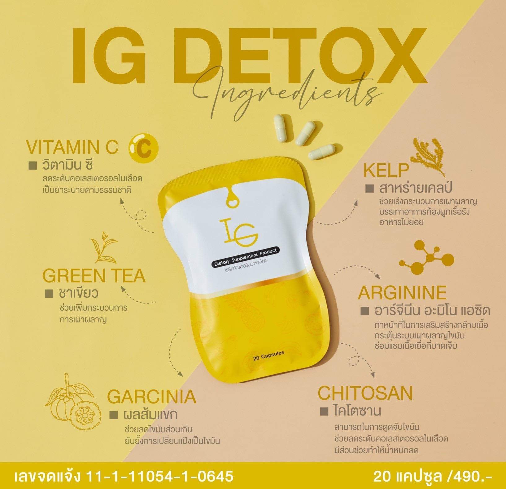 IG DETOX - VITAMIN C วิตามิน ซี ลดระดับคอเลสเตอรอลในเลือด เป็นยาระบายตามธรรมชาติ - KELP สาหร่ายเคลป์ ช่วยเร่งกระบวนการเผาผลาญ บรรเทาอาการท้องผูกเรื้อรัง อาหารไม่ย่อย - GREEN TEA ชาเขียว ช่วยเพิ่มกระบวนการการเผาผลาญ - ARGININE อาร์จีนีน อะมิโน แอซิด ทำหน้าที่ในการเสริมสร้างกล้ามเนื้อ กระตุ้นระบบเผาผลาญไขมัน ซ่อมแซมเนื้อเยื่อที่บาดเจ็บ - GARCINIA ผลส้มแขก ช่วยลดไขมันส่วนเกิน ยับยั้งการเปลี่ยนแป้งเป็นไขมัน -CHITOSAN ไคโตซาน สามารถดูดจับไขมัน ช่วยลดระดับคอเลสเตอรอลในเลือด มีส่วนช่วยทำให้น้ำหนักลด  |