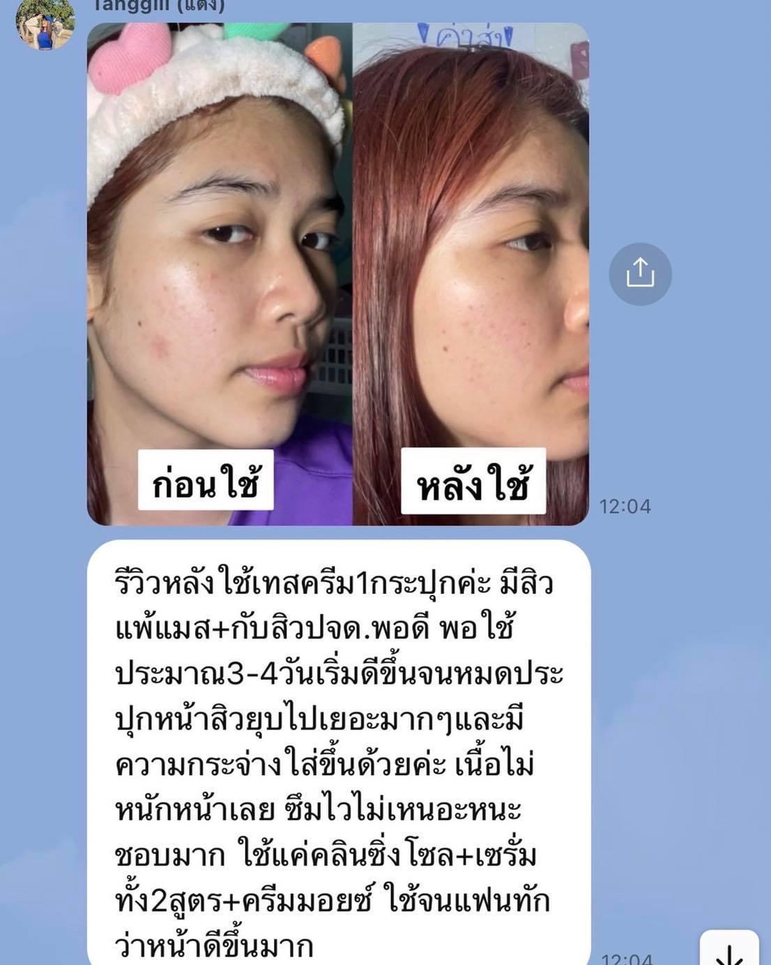 รีวิวหลังใช้เทสครีม 1 กระปุกค่ะ มีสิวแพ้แมส+กับสิวปจด.พอดี พอใช้ประมาณ 3-4 วันเริ่มดีขึ้น จนหมดประปุก สิวยุบไปเยอะมากๆ และมีความกระจ่างใสขึ้นด้วยค่ะ เนื้อไม่หนักหน้าเลย ซึมไวไม่เหนอะหนะ ชอบมาก ใช้แค่คลีนซิ่งโซล+เซรั่มทั้ง 2 สูตร+ครีมมอยซ์ ใช้จนแฟนทักว่า หน้าดีขึ้นมาก |