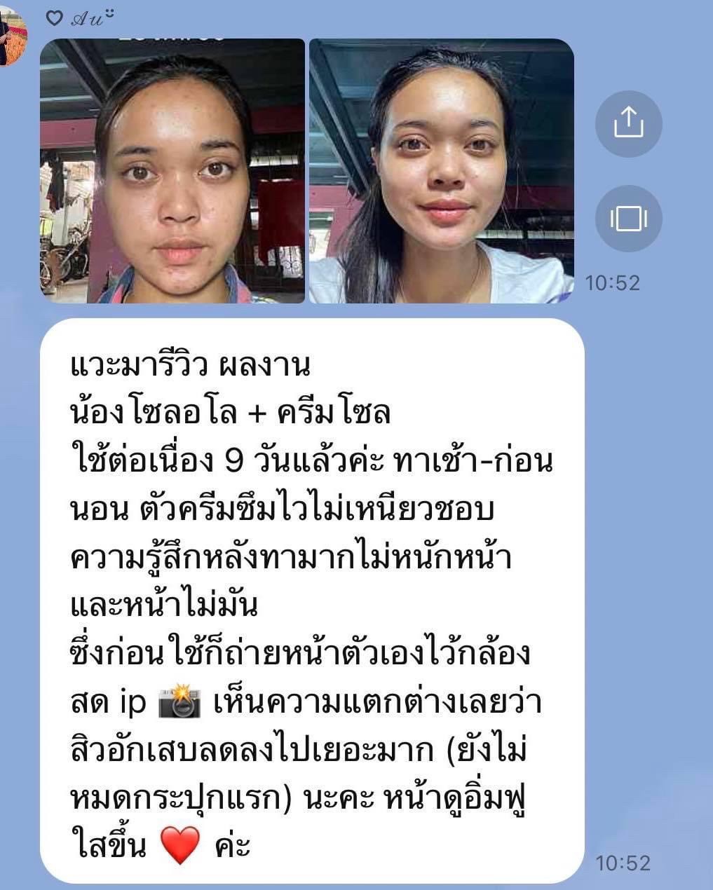 แวะมารีวิว ผลงานน้องโซล อโล + ครีม โซล ใช้ต่อเนื่อง 9 วันแล้วค่ะ ทาเช้า-ก่อนนอน ตัวครีมซึมไว ไม่เหนียว ชอบความรู้สึกหลังทามาก ไม่หนักหน้า และหน้าไม่มัน ซึ่งก่อนใช้ก็ถ่ายหน้าตัวเองไว้ กล้องสดไอโฟน เห็นความแตกต่างเลยว่า สิวอักเสบลดลงไปเยอะมาก (ยังไม่หมดกระปุกแรก) นะคะ หน้าดูอิ่มฟู ใสขึ้นค่ะ |