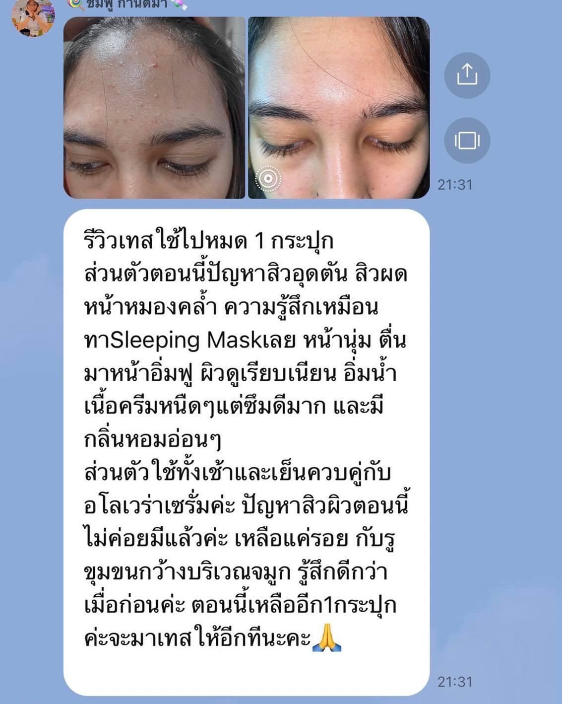 รีวิวเทสใช้ไป หมด 1 กระปุก ส่วนตัวตอนนี้ปัญหาสิวอุดตัน สิวผด หน้าหมองคล้ำ ความรู้สึกเหมือนทา Sleeping Mask เลย หน้านุ่ม ตื่นมาหน้าอิ่มฟู ผิวดูเรียบเนียน อิ่มน้ำ เนื้อครีมหนืดๆ แต่ซึมดีมาก และมีกลิ่นหอมอ่อนๆ ส่วนตัวใช้ทั้งเช้า และเย็น ควบคู่กับอโลเวร่าเซรั่มค่ะ ปัญหาสิวผิวตอนนี้ไม่ค่อยมีแล้วค่ะ เหลือแค่รอย กับรูขุมขนกว้างบริเวณจมูก รู้สึกดีกว่าเมื่อก่อนค่ะ ตอนนี้เหลืออีก 1 กระปุกค่ะ จะมาเทสให้อีกทีนะคะ |