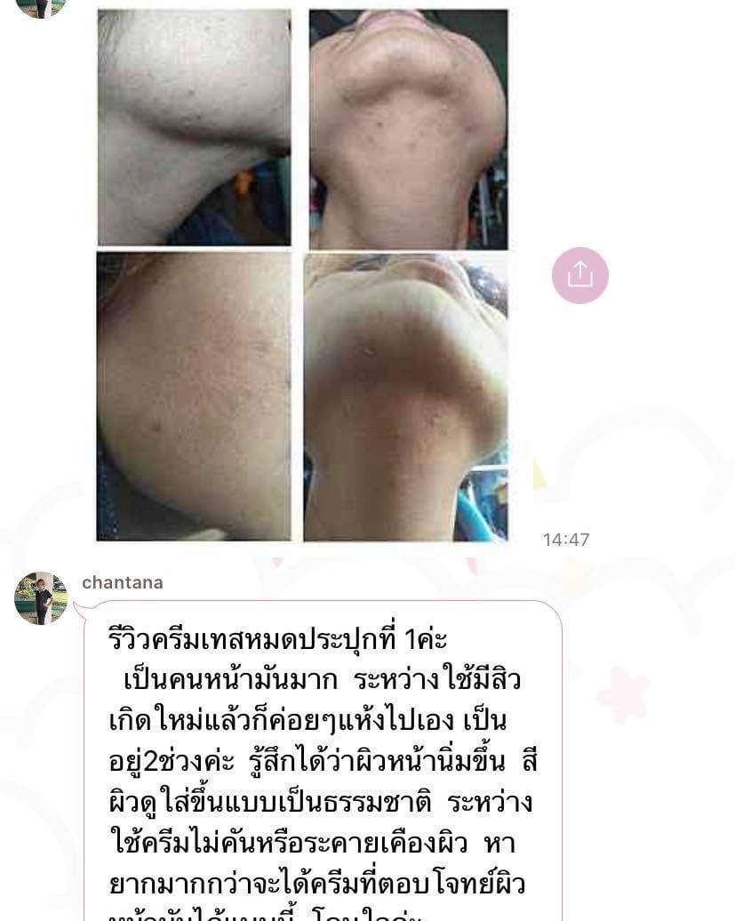 รีวิวครีมเทสหมดประปุกที่ 1 ค่ะ เป็นคนหน้ามันมาก ระหว่างใช้มีสิวเกิดใหม่ แล้วก็ค่อยๆแห้งไปเอง เป็นอยู่ 2 ช่วงค่ะ รู้สึกได้ว่าผิวหน้านิ่มขึ้น สีผิวดูใสขึ้นแบบเป็นธรรมชาติ ระหว่างใช้ครีมไม่คันหรือ ระคายเคืองผิว หายากมากกว่า จะได้ครีมที่ตอบโจทย์ผิวตัวเอง |