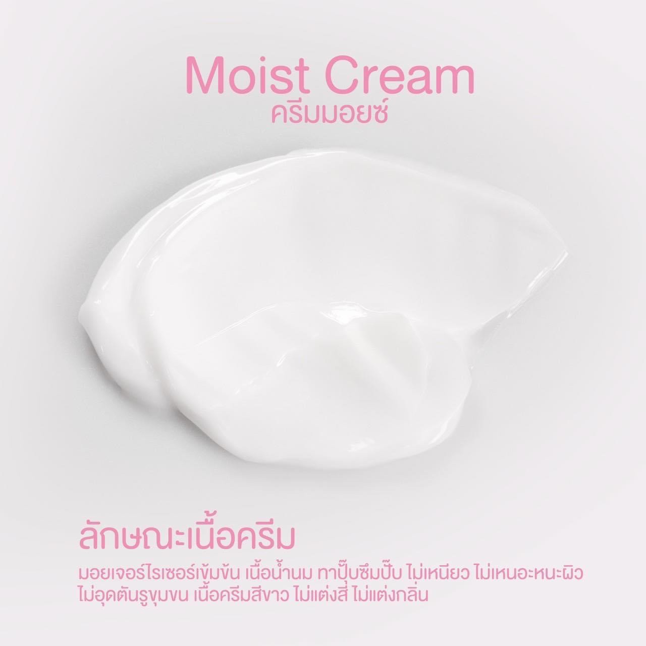 Moist Cream ครีมมอยซ์ ลักษณะเนื้อครีม มอยเจอร์ไรเซอร์เข้มข้น เนื้อน้ำนม ทาปั๊บซึมปั๊บ ไม่เหนียว ไม่เหนียวเหนอะหนะผิว ไม่อุดตันรูขุมขน เนื้อครีมสีขาว ❌ไม่แต่งสี ❌ไม่แต่งกลิ่น |