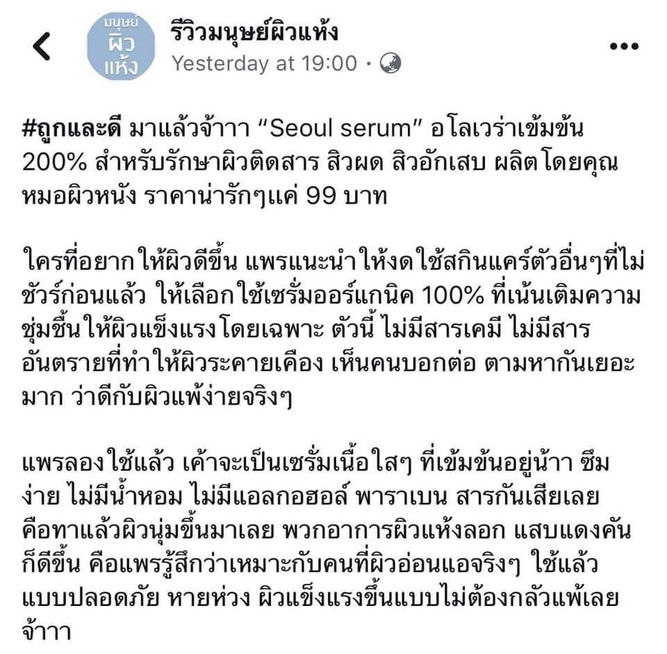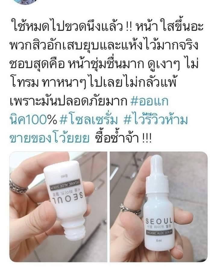 #ถูกและดี มาแล้วจ้าาา "Seoul serum" อโลเวร่าเข้มข้น 200% สำหรับรักษาผิวติดสาร สิวผด สิวอักเสบ ผลิตโดยคุณหมอผิวหนัง ราคาน่ารักๆแค่ 99 บาท ใครที่อยากให้ผิวดีขึ้น แพรแนะนำให้งดใช้สกินแคร์ตัวอื่นๆ ที่ไม่ชัวร์ก่อน แล้วให้เลือกใช้เซรั่มออร์แกนิค 100% ที่เน้นเติมความชุ่มชื้นให้ผิวแข็งแรง โดยเฉพาะตัวนี้ ไม่มีสารเคมี ไม่มีสารอันตราย ที่ทำให้ผิวระคายเคือง เห็นคนบอกต่อ ตามหากันเยอะมาก ว่าดีกับผิวแพ้ง่ายจริงๆ แพรลองใช้แล้ว เค้าจะเป็นเซรั่มเนื้อใสๆที่เข้มข้นอยู่น้าา ซึมง่าย ไม่มีน้ำหอม ไม่มีแอลกอฮอล์ พาราเบน สารกันเสียเลย คือทาแล้วผิวนุ่มขึ้นมาเลย พวกอาการผิวแห้งลอก แสบ แดง คัน ก็ดีขึ้น คือแพรรู้สึกว่าเหมาะกับคนที่ผิวอ่อนแอจริงๆ ใช้แล้วแบบปลอดภัยหายห่วง ผิวแข็งแรงขึ้นแบบไม่ต้องกลัวแพ้เลยจ้า |