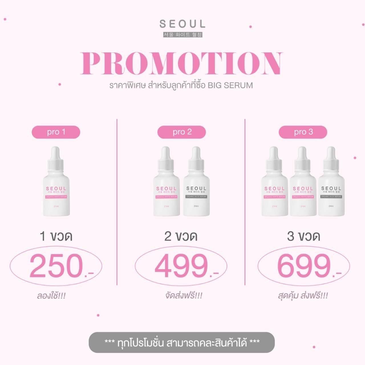 ราคาและโปรโมชั่น โซล เซรั่ม Seoul Serum 1 ขวด ราคา 250 บาท 2 ขวด ราคา 499 บาท 3 ขวด ราคา 699 บาท มีบริการเก็บเงินปลายทาง |