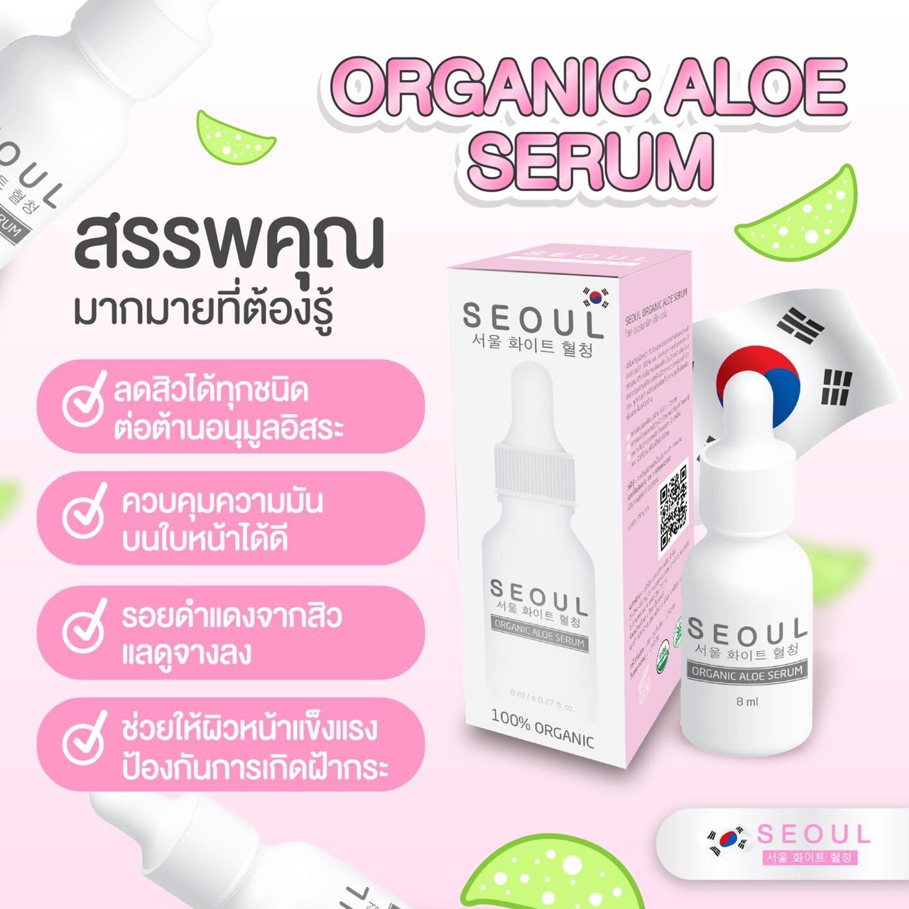สรรพคุณ เซรั่มโซล อโล Seoul Aloe Serum ดียังไง? ช่วยเรื่องอะไรบ้าง? ✅ ลดสิวได้ทุกชนิด ต่อต้านอนุมูลอิสระ ✅ ควบคุมความมันบนใบหน้าได้ดี ✅ รอยดำ แดง จากสิว แลดูจางลง ✅ ช่วยให้ผิวหน้าแข็งแรง ป้องกันการเกิดฝ้า กระ |