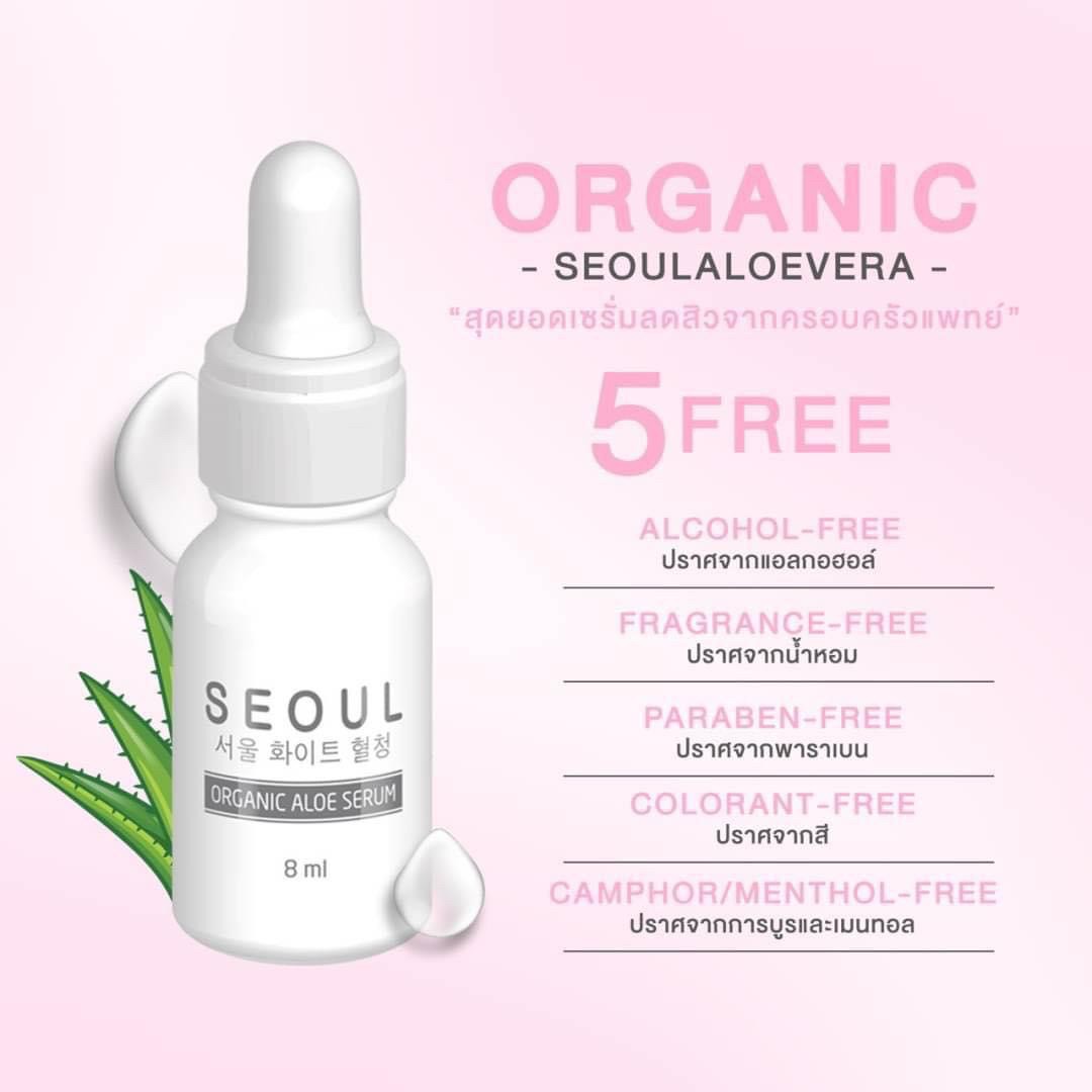 เซรั่มโซล อโล Seoul Aloe Serum 5 Free 🚫 Alcohol-Free ปราศจากแอลกอฮอล์ 🚫 Fragrance-Free ปราศจากน้ำหอม 🚫 Paraben-Free ปราศจากพาราเบน 🚫 Colorant-Free ปราศจากสี 🚫 Camphor/Menthol-Free ปราศจากการบูร และเมนทอล |