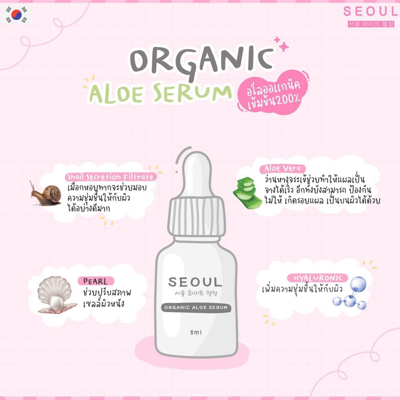 สารสกัดหลักของ เซรั่มโซล อโล Seoul Aloe Serum 💧 Snail secretion Filtrate เมือกหอยทาก จะช่วยมอบความชุ่มชื้นให้กับผิวได้อย่างดีมาก 💧 Aloe Vera ว่านหางจระเข้ ช่วยทำให้แผลเป็นจางได้เร็ว อีกทั้งยังสามารถป้องไม่ให้เกิดรอยแผลเป็นบนผิวได้ด้วย 💧 Pearl ช่วยปรับสภาพเซลล์ผิวหนัง 💧 Hyaluronic เพิ่มความชุ่มชื้นให้ผิว |