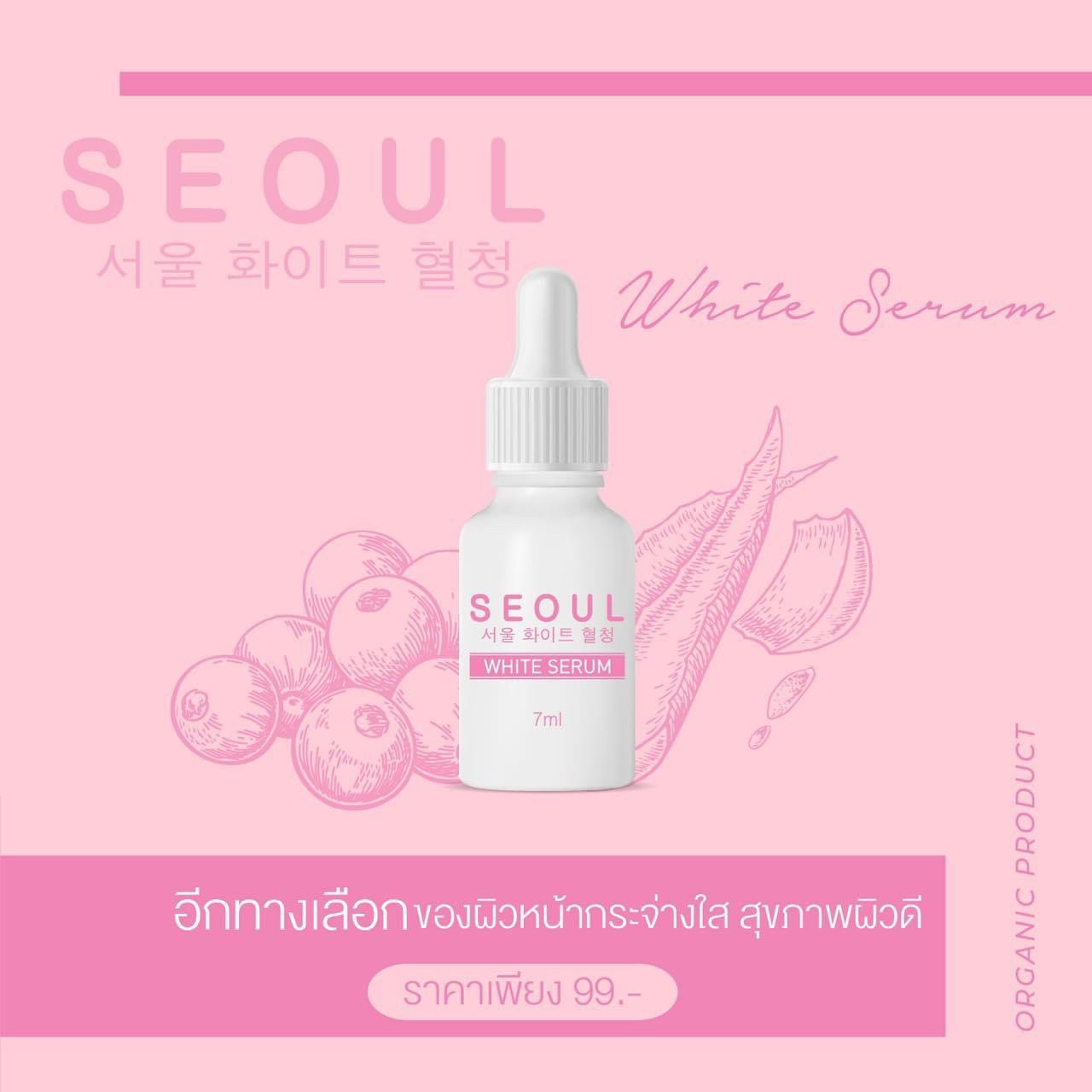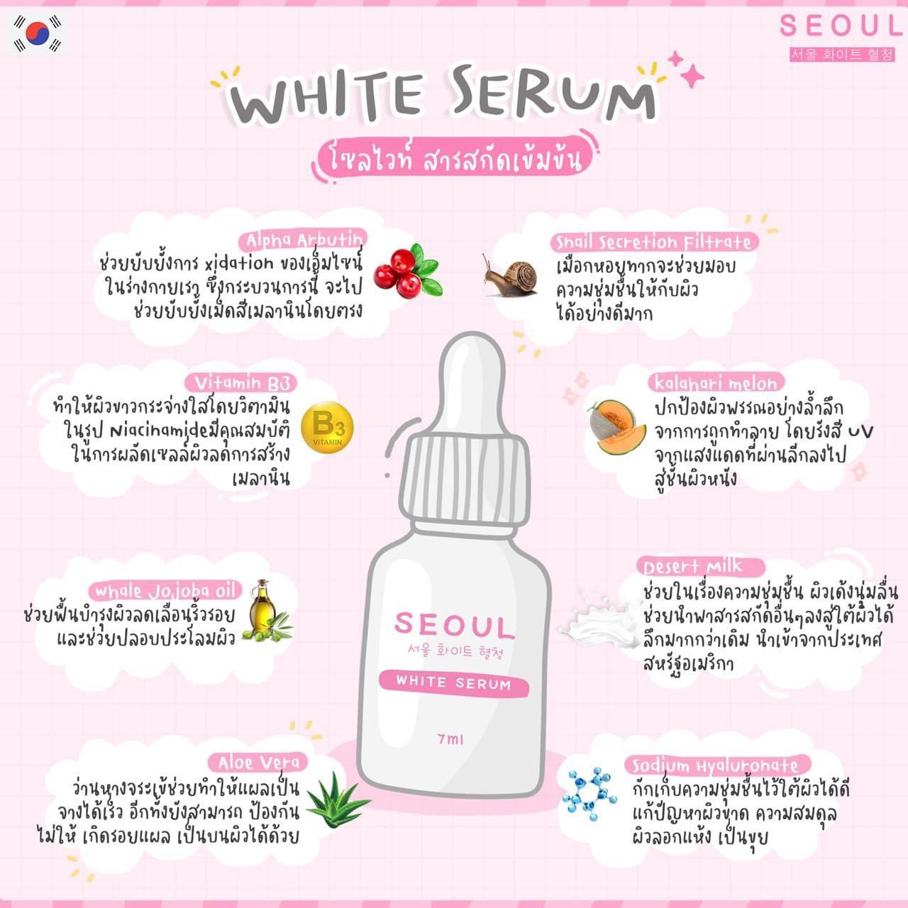 โซล ไวท์เซรั่ม Seoul White Serum 🌟 ผิวหน้ากระจ่างใส 🌟 ผิวหน้านุ่ม ชุ่มชื้น 🌟 กระชับรูขุมขน 🌟 ผลัดเซลล์ผิวเก่า 🌟 บำรุงผิวให้แข็งแรง 🌟 มีส่วนช่วยลด ฝ้า กระ |