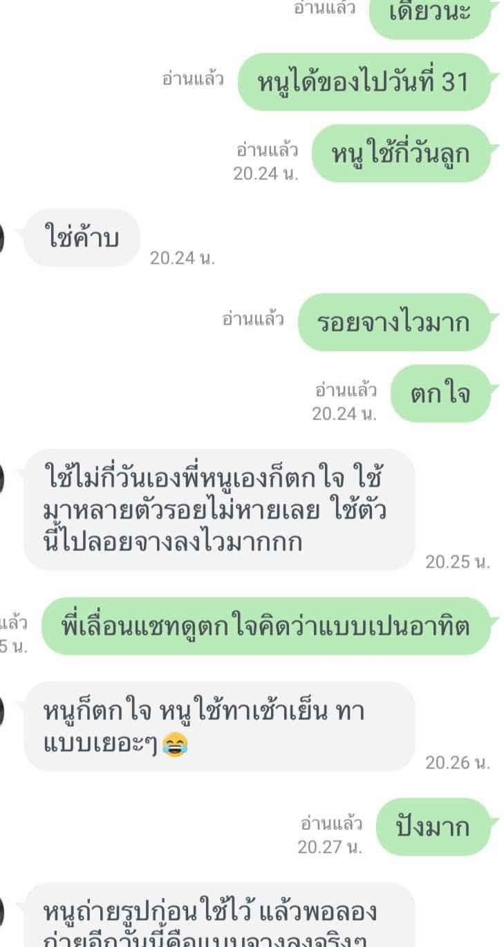 ใช้ไม่กี่วันเองค่ะ พี่หนูเองก็ตกใจ ใช้มาหลายตัว รอยไม่หายเลย ใช้ตัวนี้ไป ลอยจางลงไวมาก หนูก็ตกใจ หนูทาเช้าทาเย็น ทาแบบเยอะๆ |