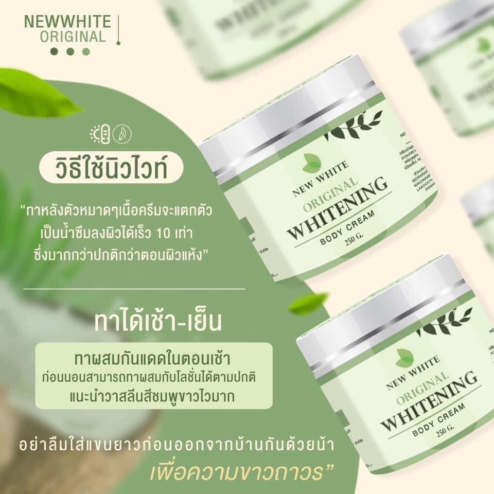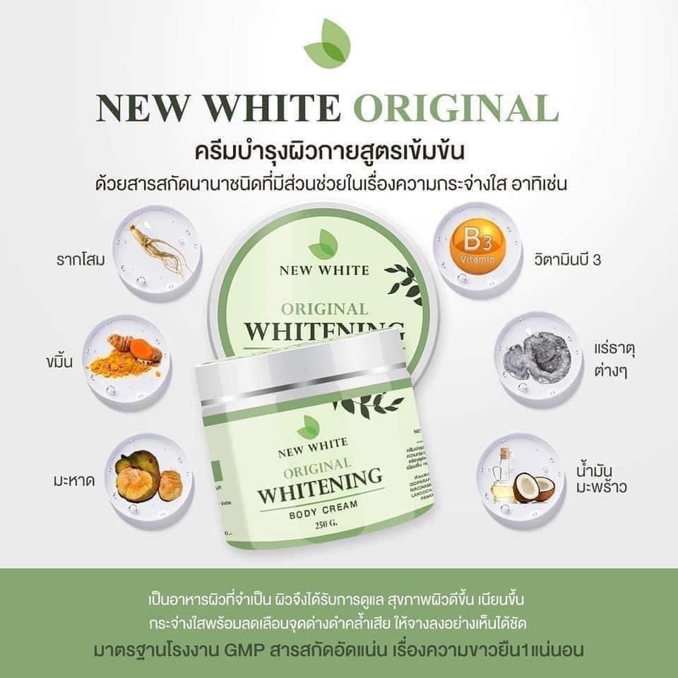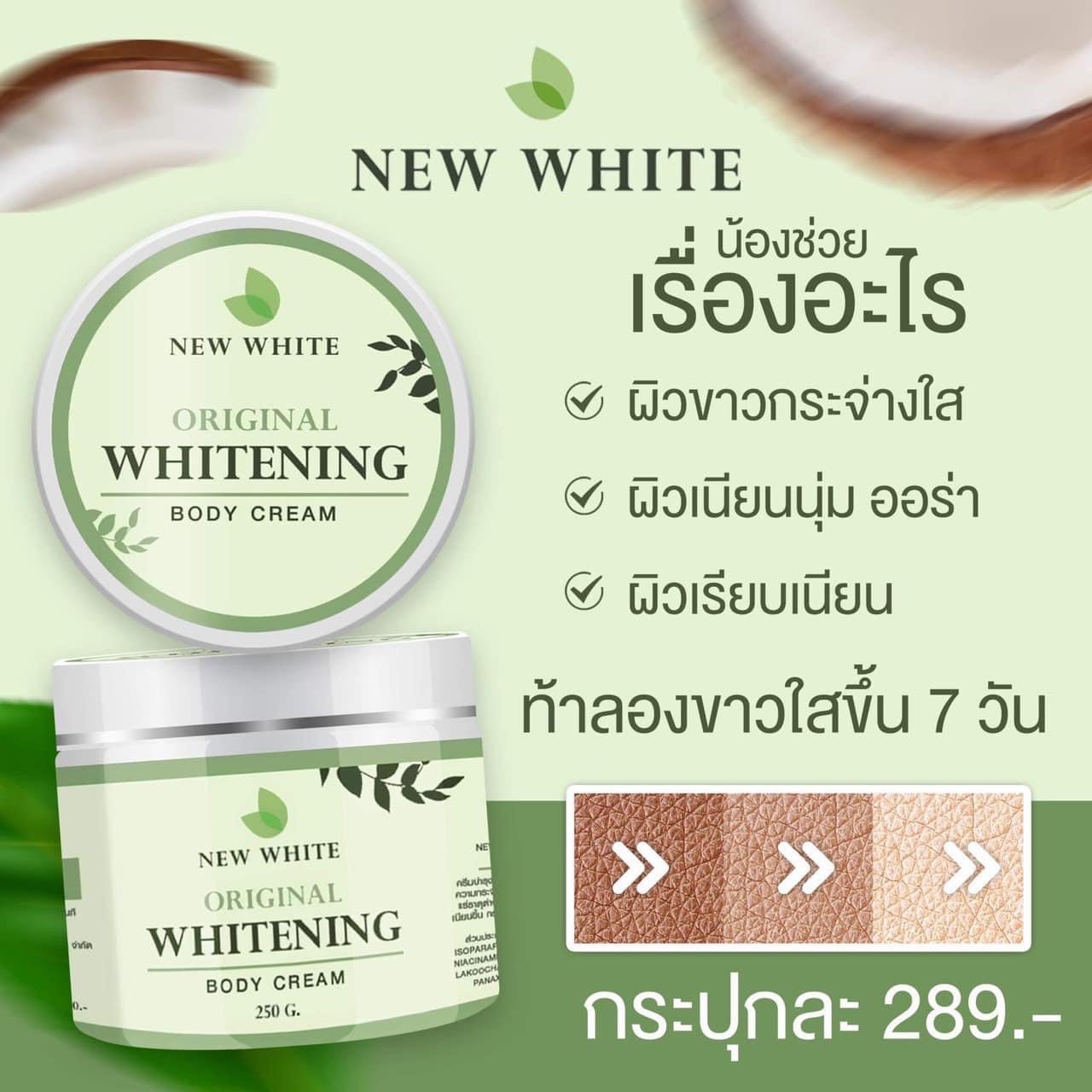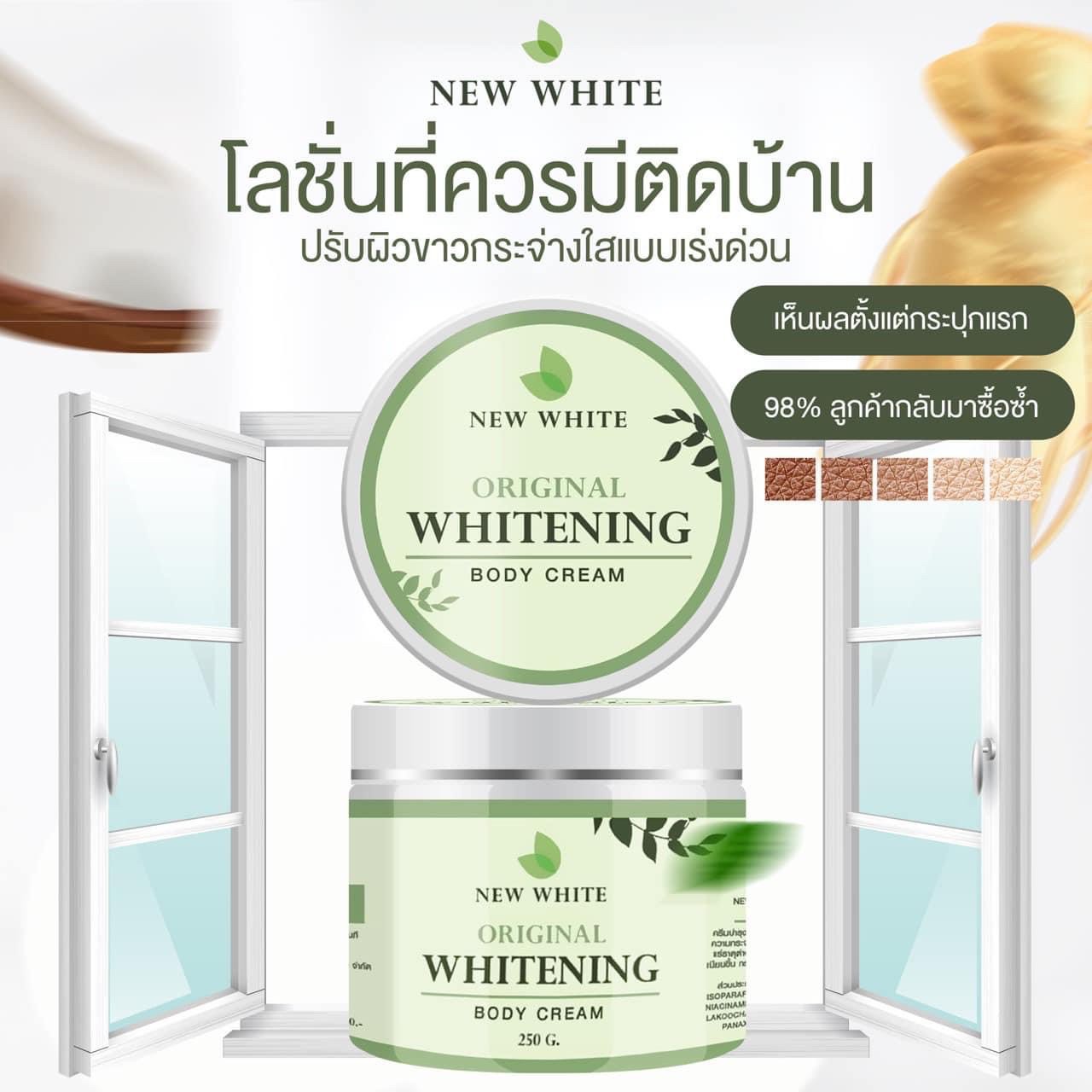 นิวไวท์ โลชั่นผิวขาว New white original whitening body cream มีส่วนช่วยในเรื่อง บำรุงผิวกาย ลดรอยดำ รอยแดง ปรับผิวขาวกระจ่างใส ช่วยให้ผิวชุ่มชื้น ไม่แห้ง และฟื้นฟูผิวคล้ำเสีย |