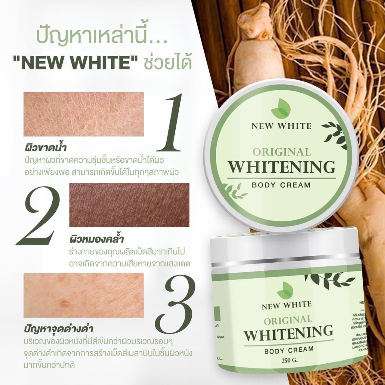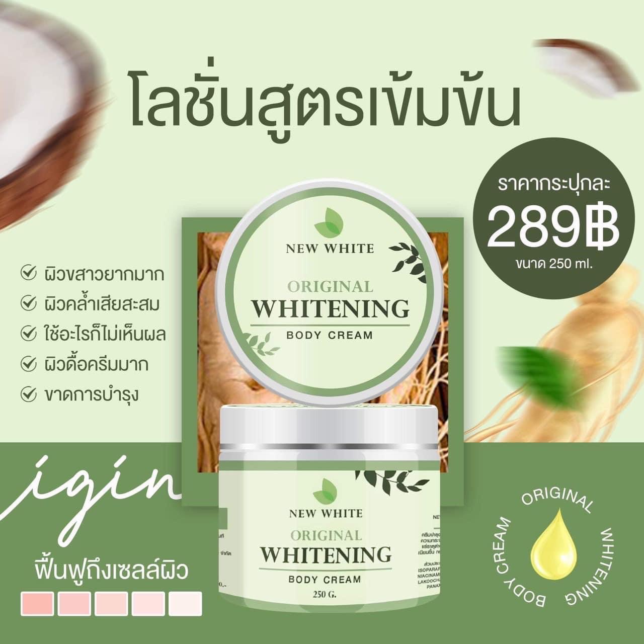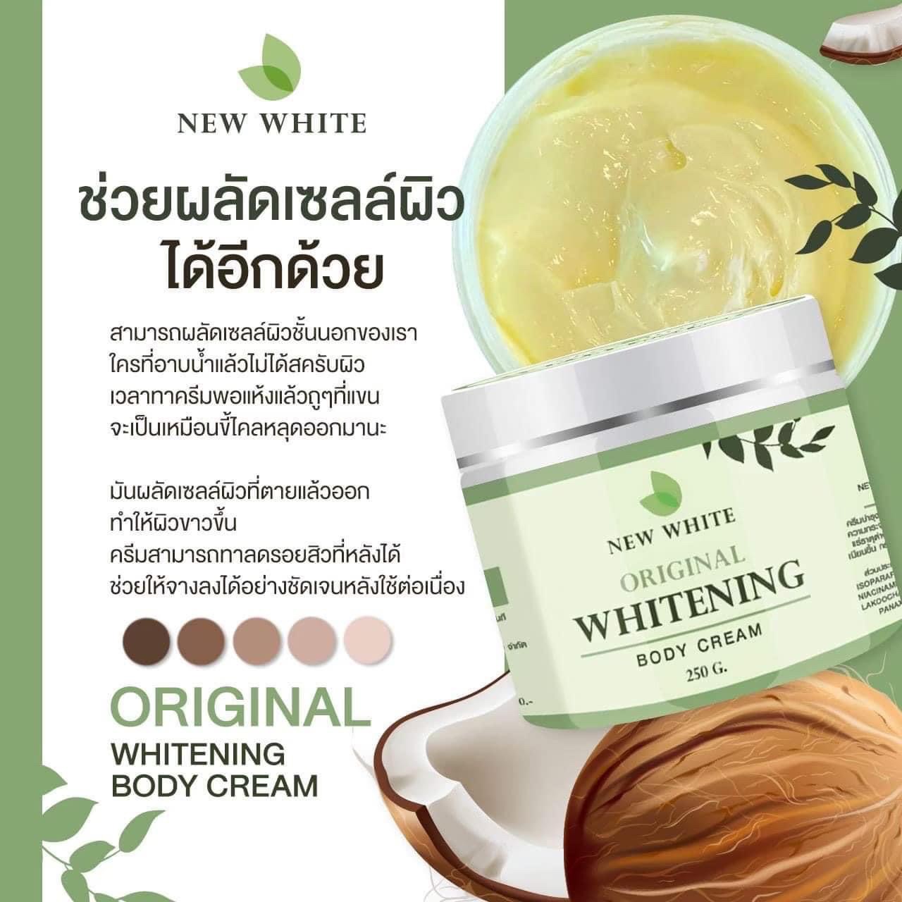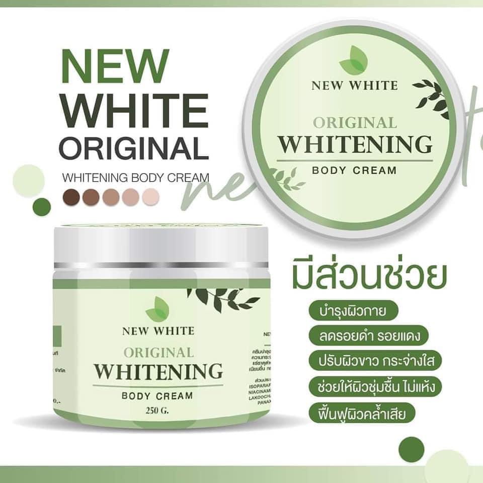 นิวไวท์ โลชั่นผิวขาว New white original whitening body cream มีส่วนช่วยในเรื่อง บำรุงผิวกาย ลดรอยดำ รอยแดง ปรับผิวขาวกระจ่างใส ช่วยให้ผิวชุ่มชื้น ไม่แห้ง และฟื้นฟูผิวคล้ำเสีย |