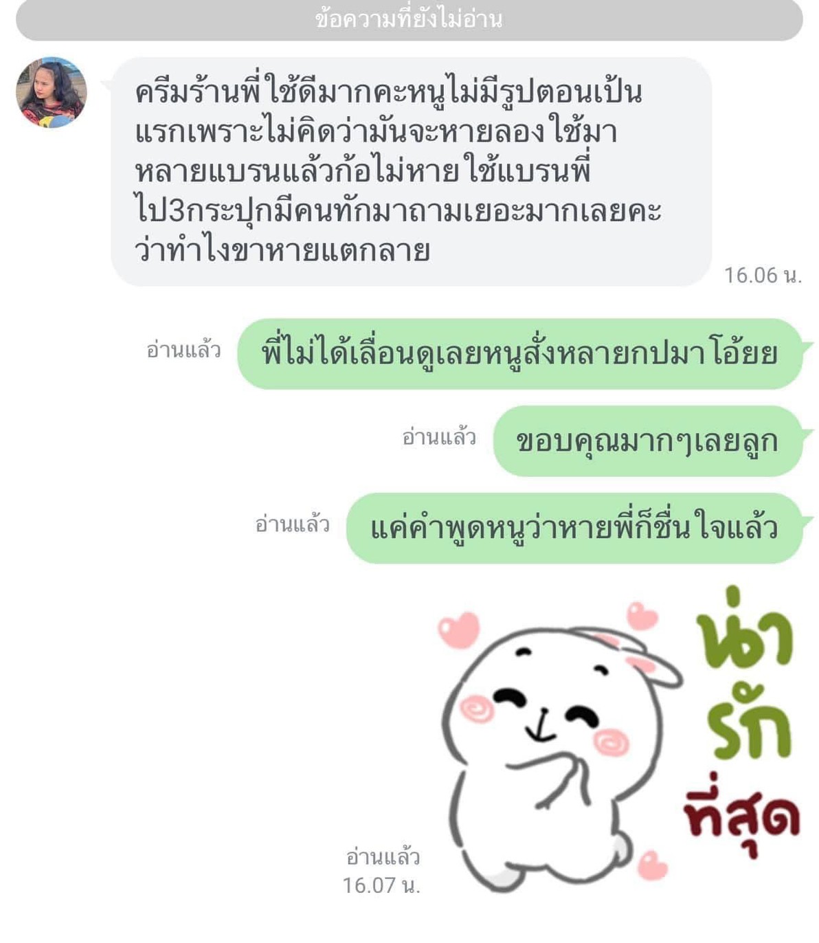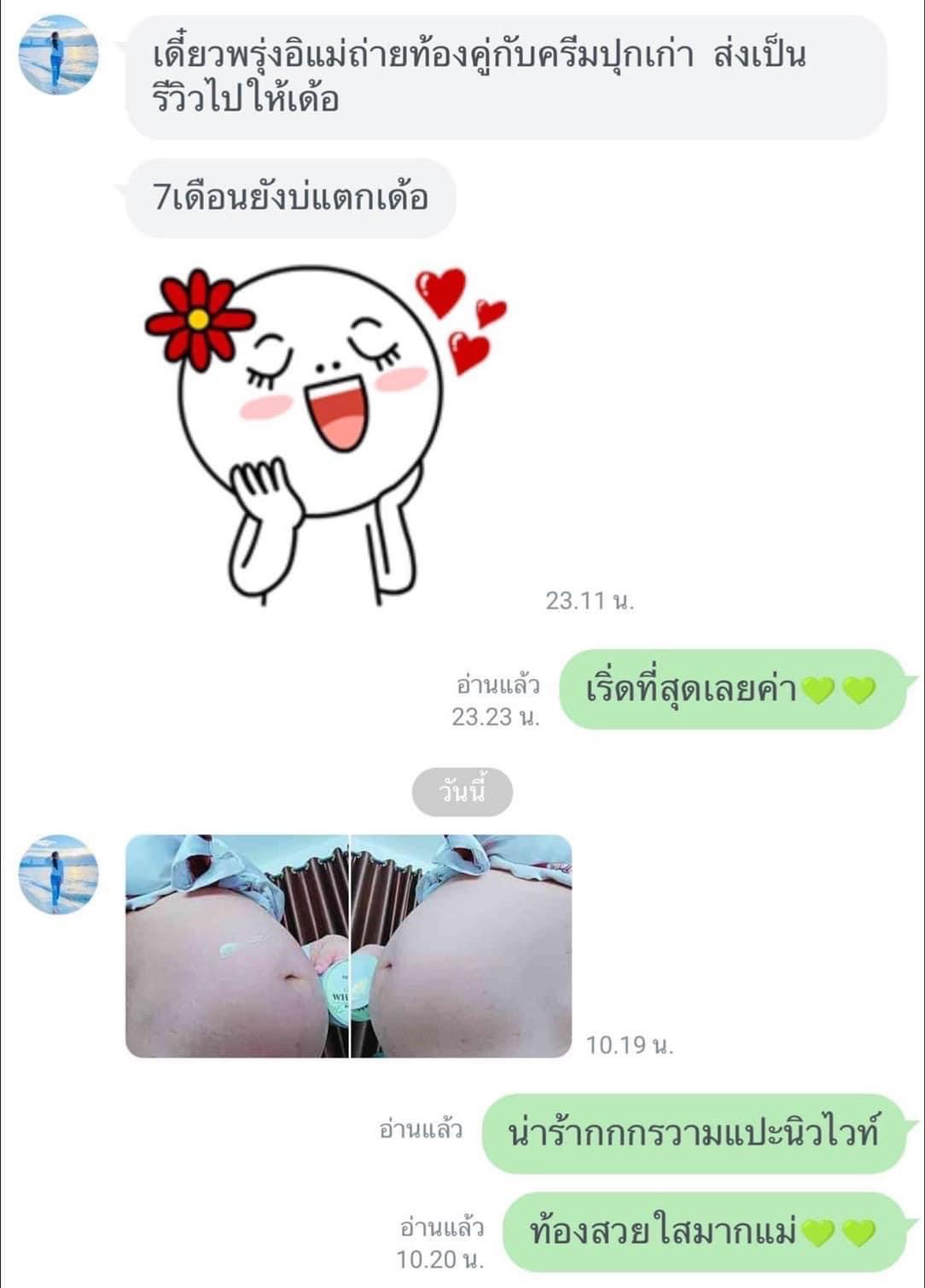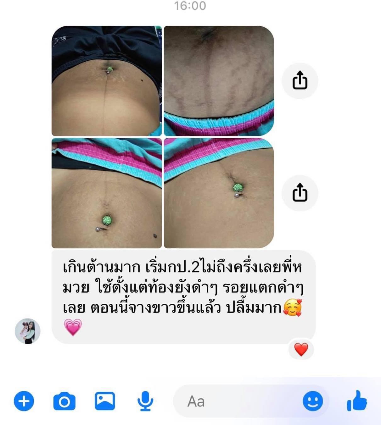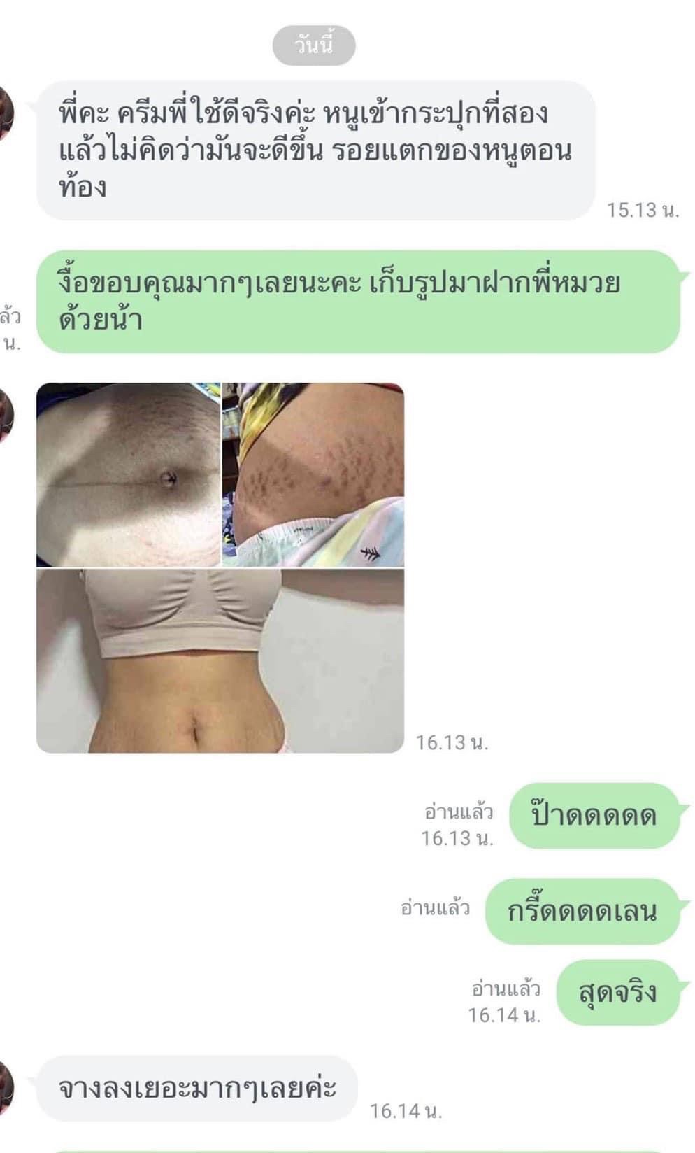 พี่คะ ครีมพี่ใช้ดีจริงค่ะ หนูเข้ากระปุกที่สองแล้ว ไม่คิดว่ามันจะดีขึ้น รอยแตกตรงท้องหนู จางลงเยอะมากๆเลยค่ะ |