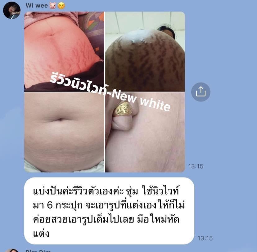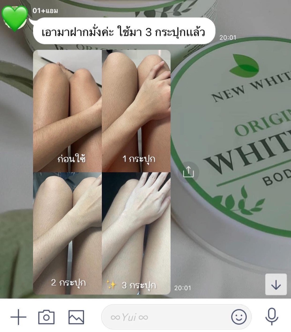 นิวไวท์ โลชั่นผิวขาว New white original whitening body cream ช่วยผลัดเซลล์ผิวได้ด้วย!! สามารถผลัดเซลล์ผิวชั้นนอกของเรา ใครที่อาบน้ำแล้วไม่ได้สครับผิว เวลาทาครีมพอแห้งแล้ว ถูๆที่แขน จะเป็นเหมือนขี้ไคลหลุดออกมานะ มันผลัดเซลล์ผิวที่ตายแล้วออก ทำให้ผิวขาวขึ้น ครีมสามารถทาลดรอยสิวที่หลังได้ ช่วยให้จางลงได้อย่างชัดเจน หลังใช้ต่อเนื่อง |