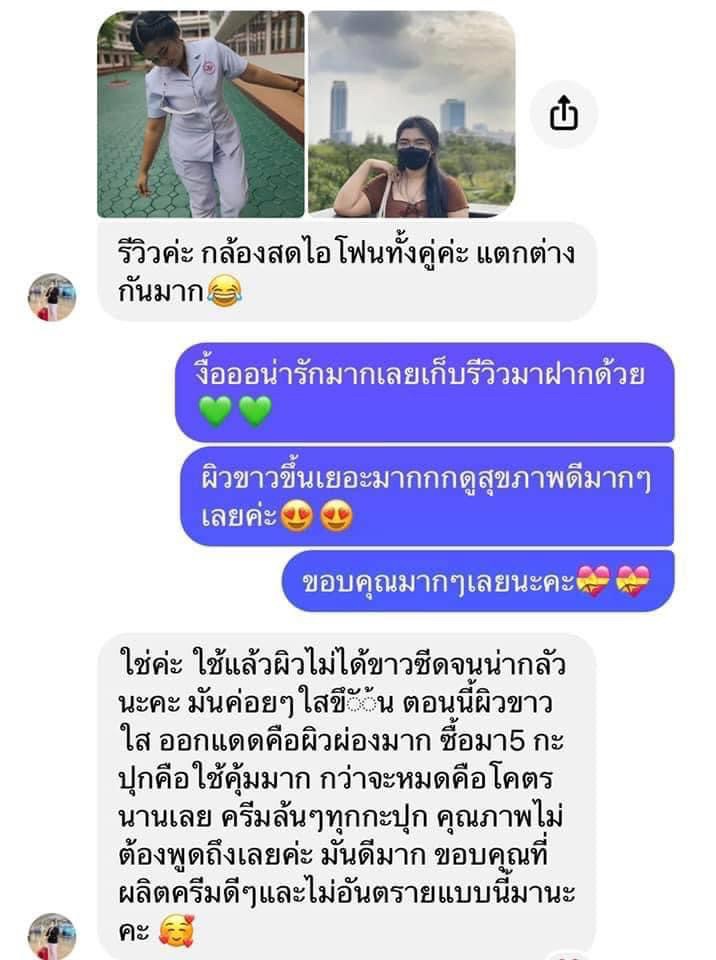 ใช้แล้วผิวไม่ได้ขาวซีดจนหน้ากลัวนะคะ มันค่อยๆใสขึ้น ตอนนี้ผิวขาวใส ออกแดดคือ ผิวผ่องมาก ซื้อมา 5 กระปุก คือใช้คุ้มมาก กว่าจะหมดคือ โคตรนานเลย ครีมล้นๆทุกกระปุก คุณภาพไม่ต้องพูดถึงเลยค่ะ มันดีมาก ขอบคุณที่ผลิตครีมดีๆ และไม่อันตรายแบบนี้มานะคะ |