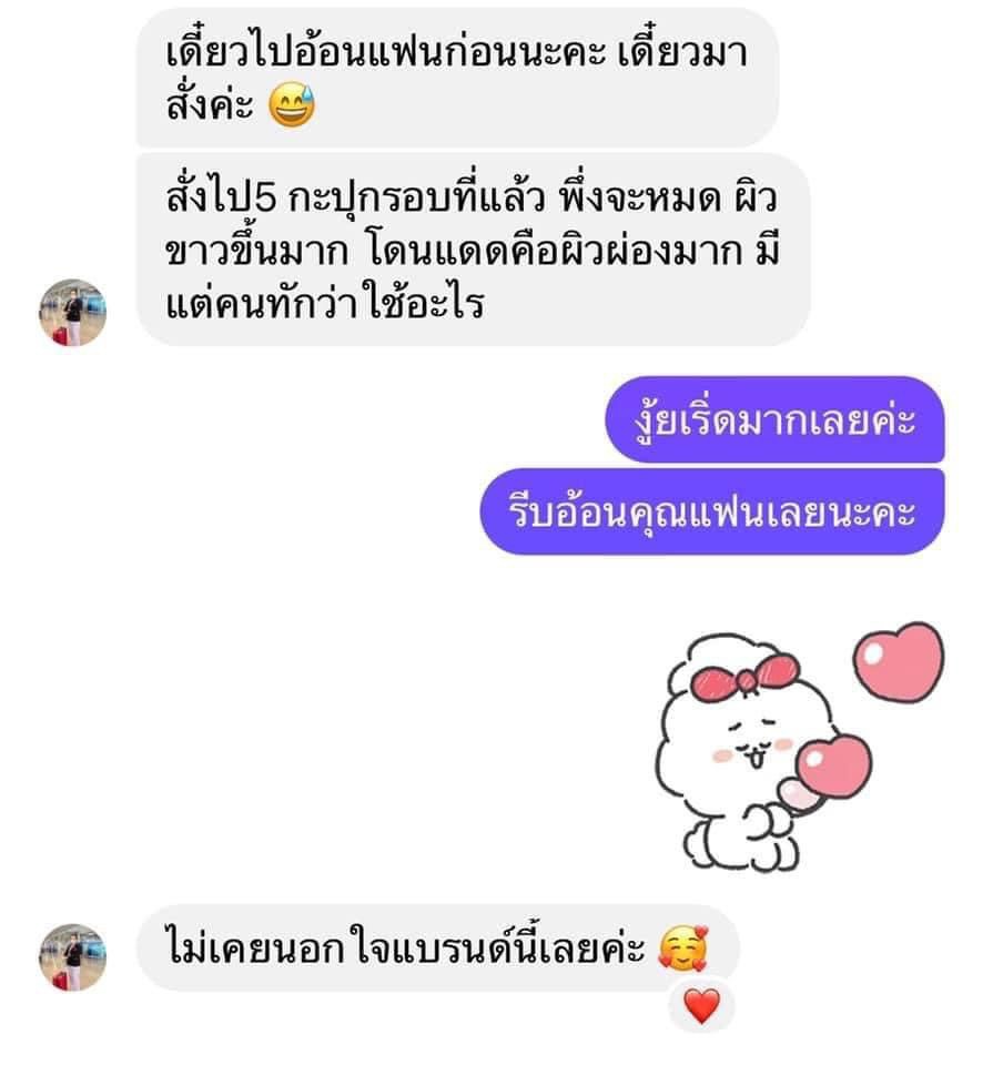 สั่งไป 5 กระปุกค่ะ รอบที่แล้ว พึ่งจะหมด ผิวขาวขึ้นมาก โดนแดดคือ ผิวผ่องมาก มีแต่คนทักว่าใช้อะไร |