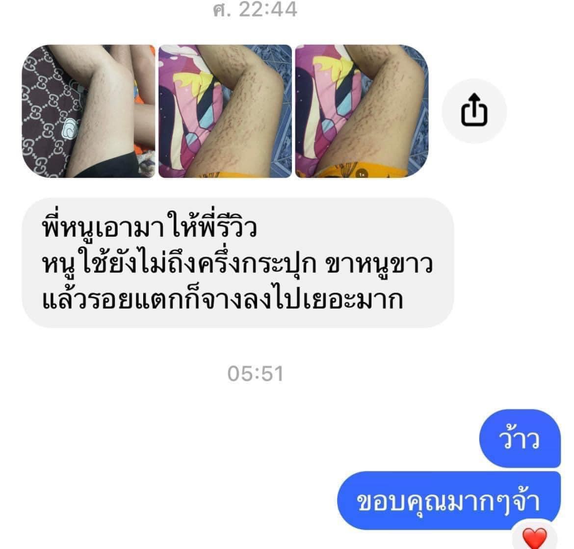 พี่ หนูเอามาให้พี่รีวิว หนูใช้ยังไม่ถึงครึ่งกระปุก ขาหนูขาวแล้ว รอยแตกก็จางลงไปเยอะมาก |