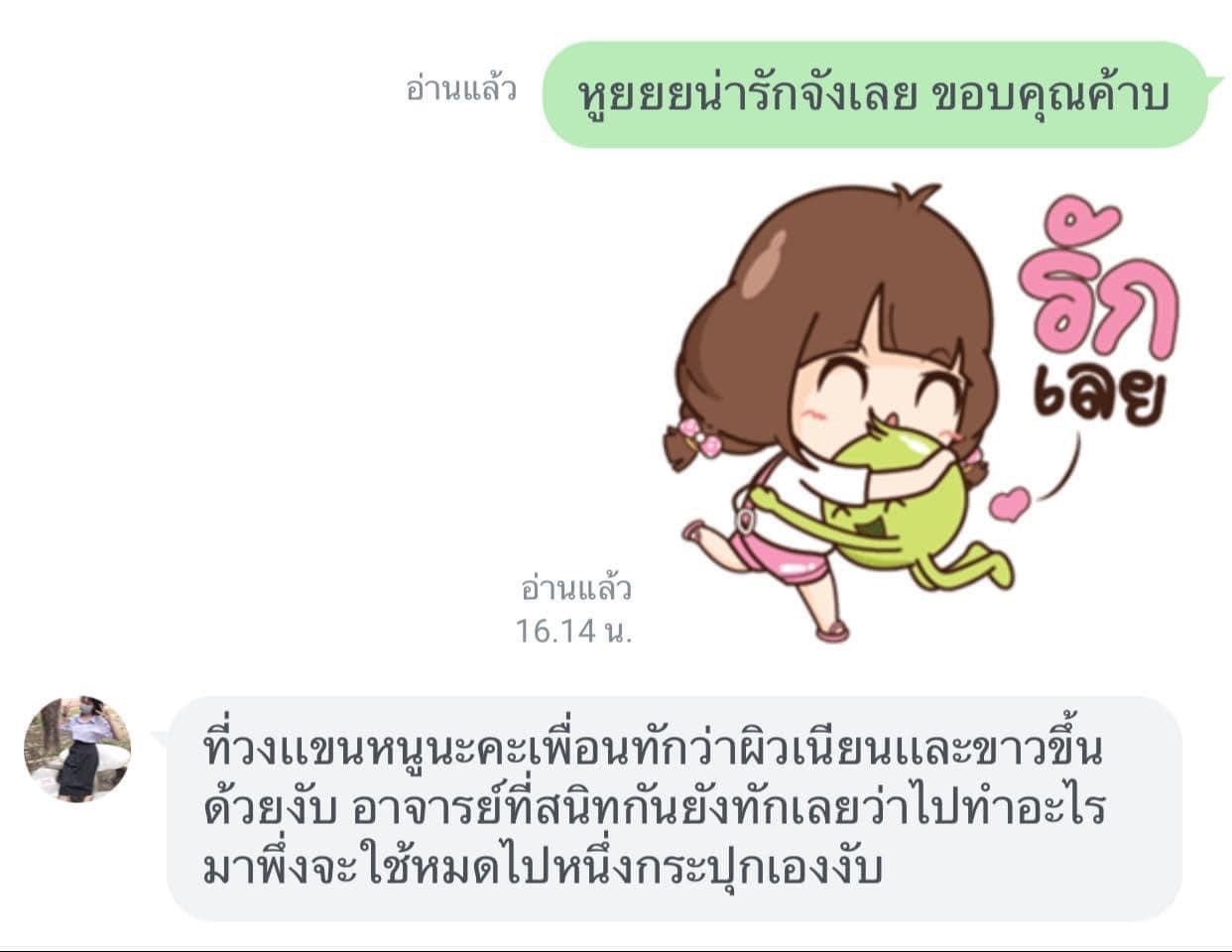 ที่วงแขนหนูนะคะ เพื่อนทักว่าผิวเนียน และขาวขึ้นด้วยงับ อาจารย์ที่สนิทกัน ยังทักเลยว่าไปทำอะไรมา พึ่งจะใช้หมดไปหนึ่งกระปุกเองค่ะ |