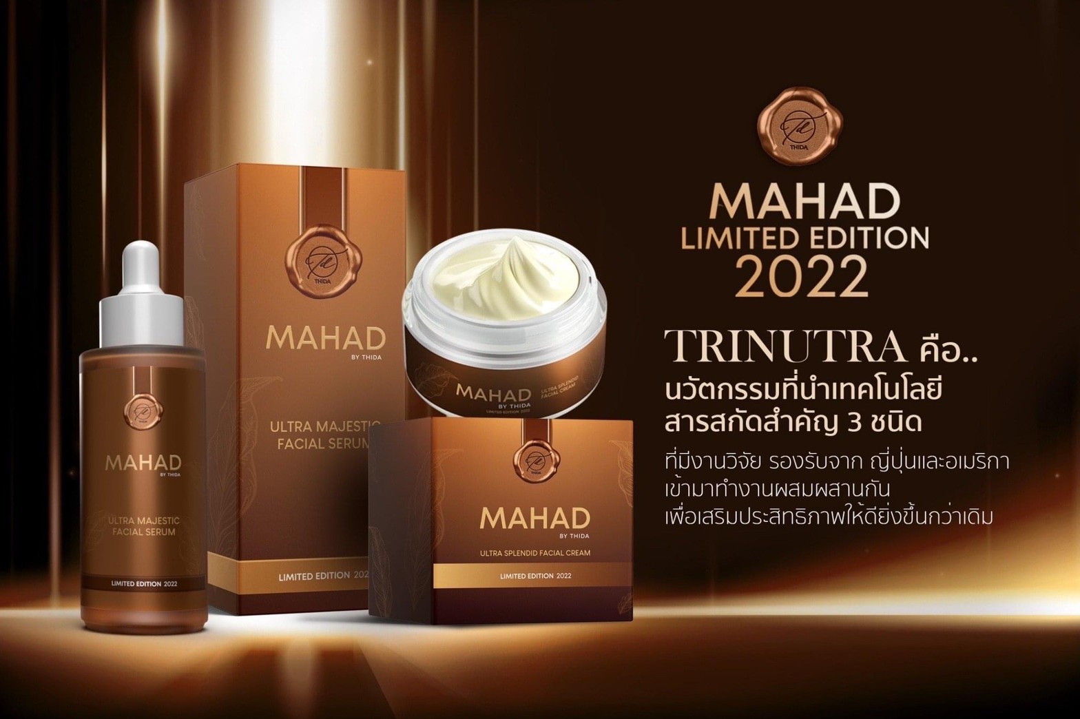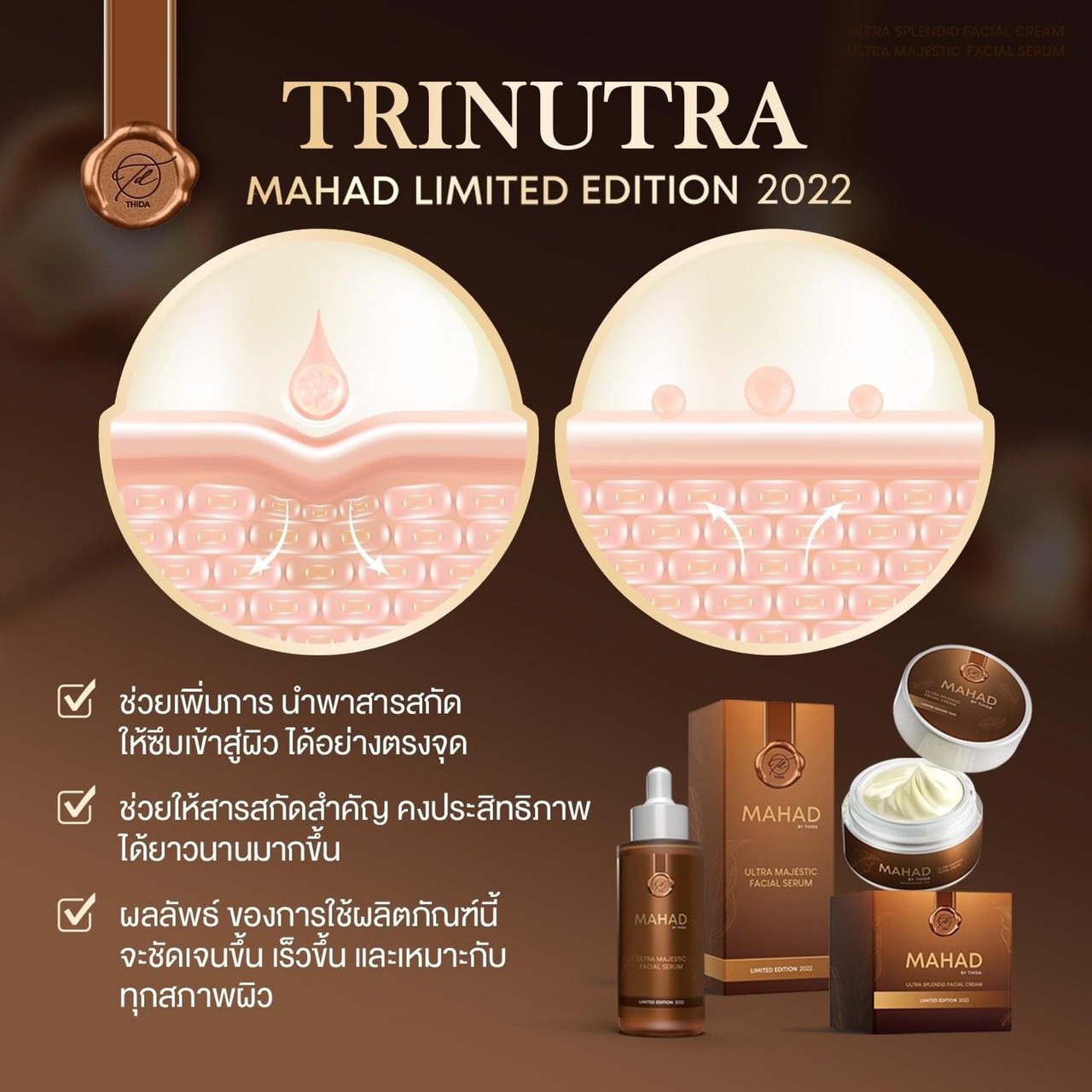 มะหาด บาย ธิดา ลิมิเต็ด เอดิชั่น 2022 อัลตรา มาเจสทิก เฟเชียล เซรั่ม MAHAD BY THIDA LIMITED EDITION 2022 ULTRA MAJESTIC FACIAL SERUM & มะหาด บาย ธิดา ลิมิเต็ด เอดิชั่น 2022 อัลตรา สเพลนดิด เฟเชียล ครีม MAHAD BY THIDA LIMITED EDITION 2022 ULTRA SPLENDID FACIAL CREAM TRINUTRA คือ นวัตกรรมที่นำเทคโนโลยีสารสกัด 3 ชนิด ที่มีงานวิจัยรองรับ จากญี่ปุ่นและ อเมริกา เข้ามาทำงานผสมผสานกัน เพื่อเสริมประสิทธิภาพให้ดียิ่งขึ้นกว่าเดิม |