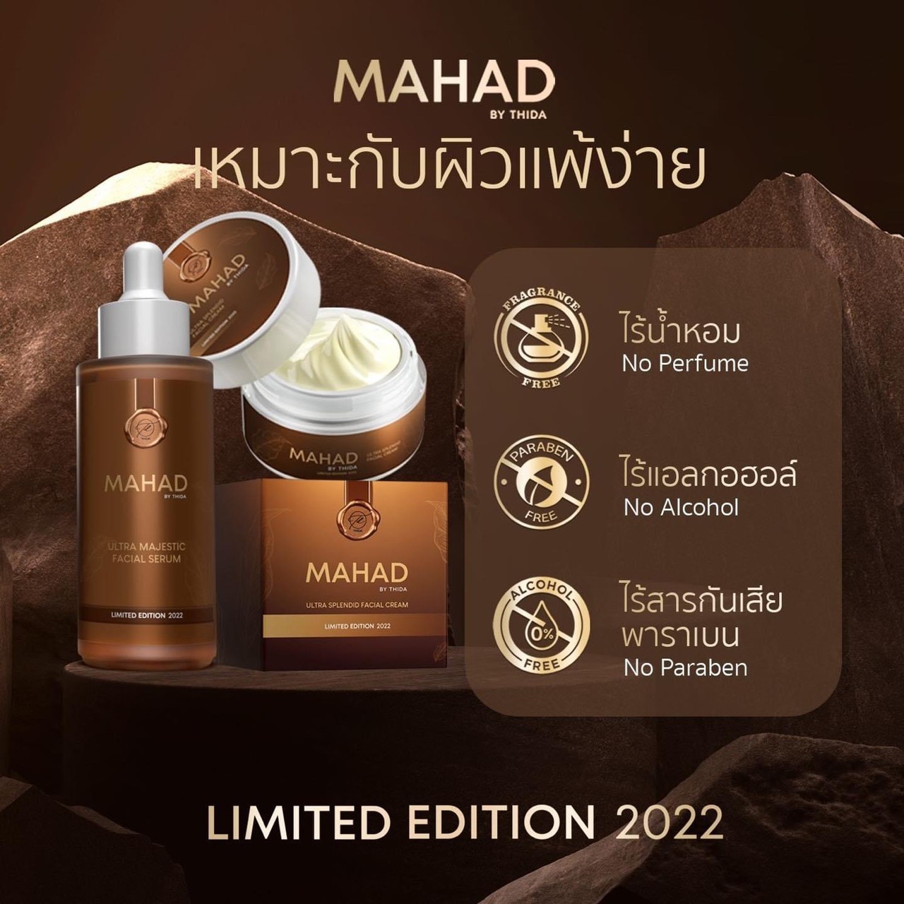มะหาด บาย ธิดา ลิมิเต็ด เอดิชั่น 2022 อัลตรา มาเจสทิก เฟเชียล เซรั่ม MAHAD BY THIDA LIMITED EDITION 2022 ULTRA MAJESTIC FACIAL SERUM & มะหาด บาย ธิดา ลิมิเต็ด เอดิชั่น 2022 อัลตรา สเพลนดิด เฟเชียล ครีม MAHAD BY THIDA LIMITED EDITION 2022 ULTRA SPLENDID FACIAL CREAM เหมาะกับผิวแพ้ง่าย 🚫 ไร้น้ำหอม No Perfume 🚫 ไร้แอลกอฮอล์ No Alcohol 🚫 ไร้สารกันเสีย พาราเบน No Paraben |