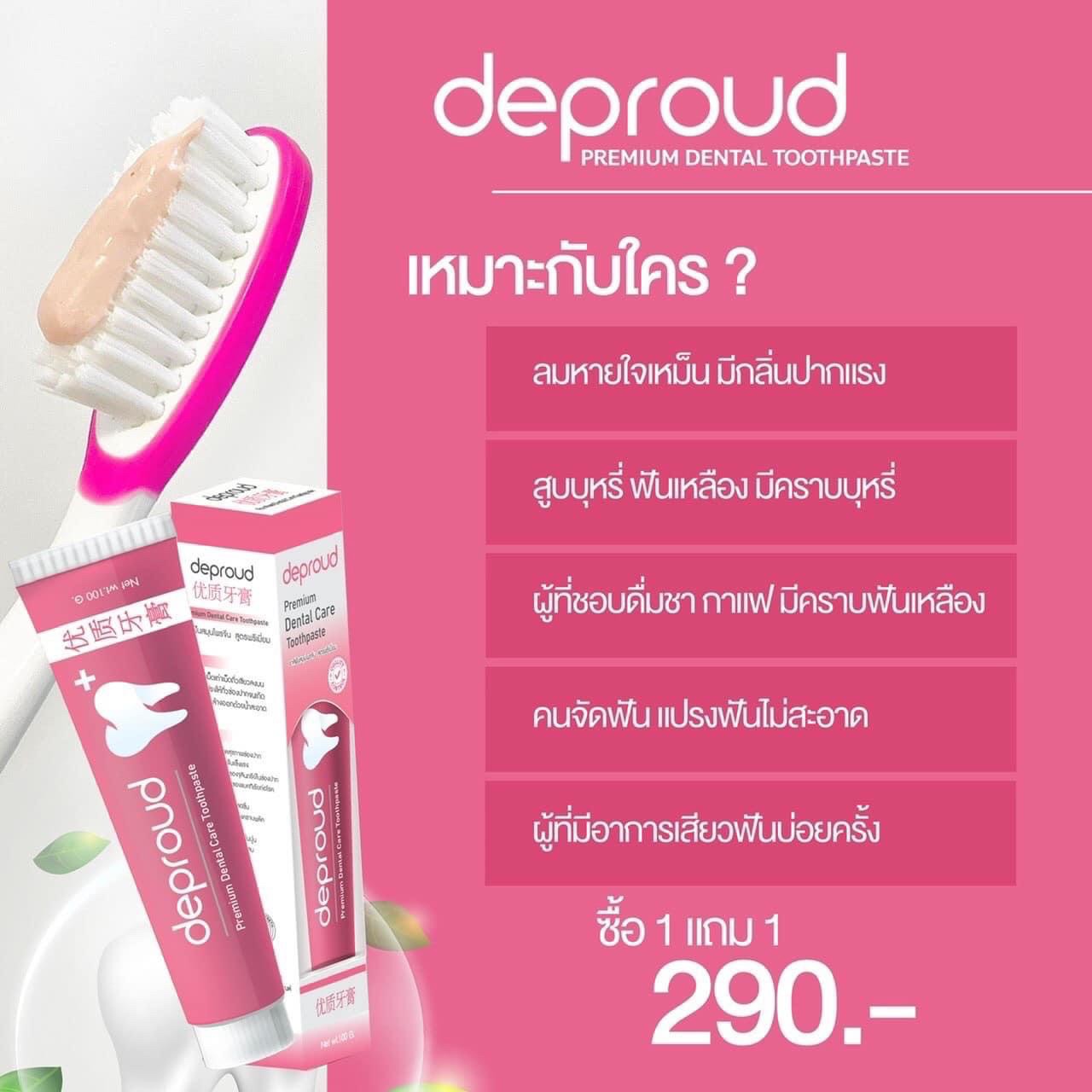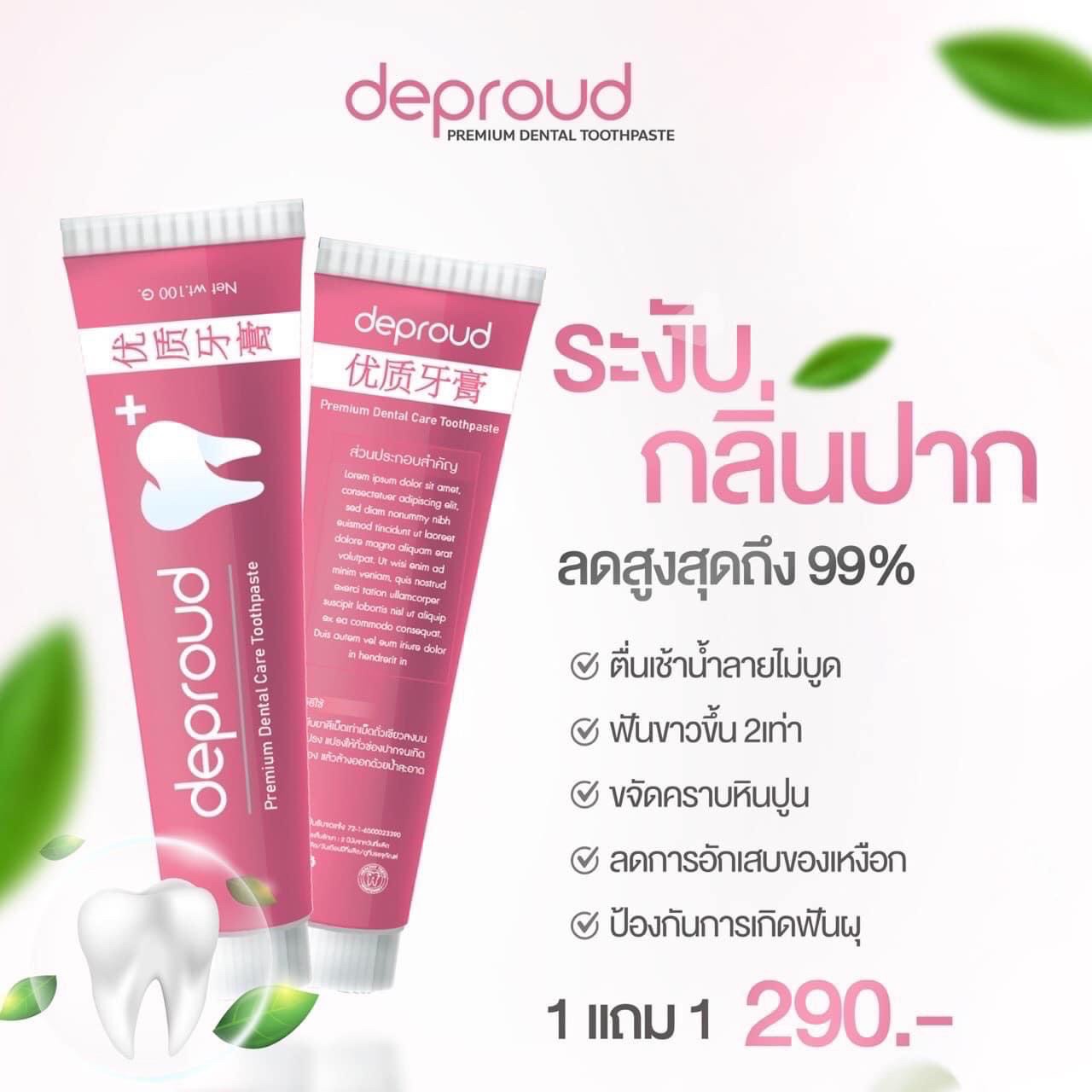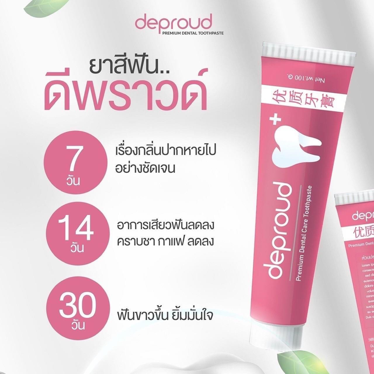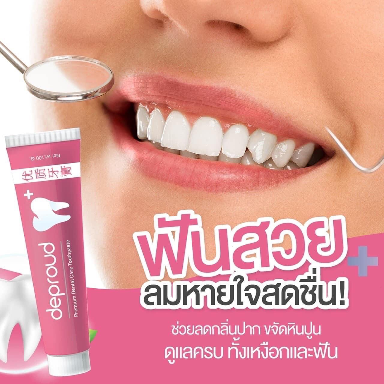 ยาสีฟันดีพราวด์ Premium Dental Care Toothpaste ระงับกลิ่นปาก ลดสูงสุดถึง 99% - ตื่นเช้า น้ำลายไม่บูด - ฟันขาวขึ้น 2 เท่า - ขจัดคราบหินปูน - ลดอาการอักเสบของเหงือก - ป้องกันการเกิดฟันผุ |