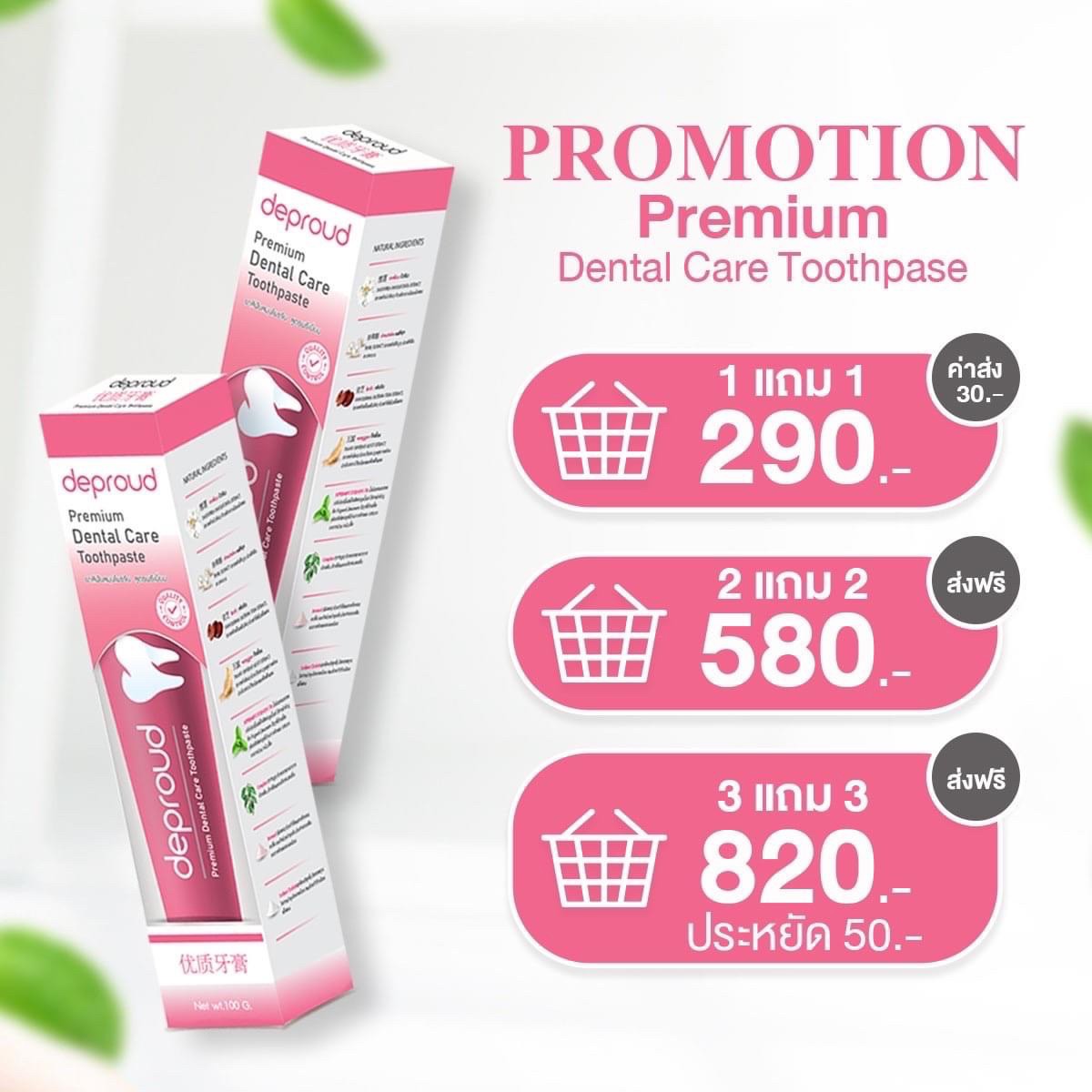 ราคาและโปรโมชั่น ยาสีฟันดีพราวด์ Premium Dental Care Toothpaste 1 หลอด แถม 1 หลอด ราคา 290 บาท ค่าส่ง 30 บาท 2 หลอด แถม 2 หลอด ราคา 580 บาท 3 หลอด แถม 3 หลอด ราคา 820 บาท 2 หลอดขึ้นไป ส่งฟรี มีบริการเก็บเงินปลายทาง |