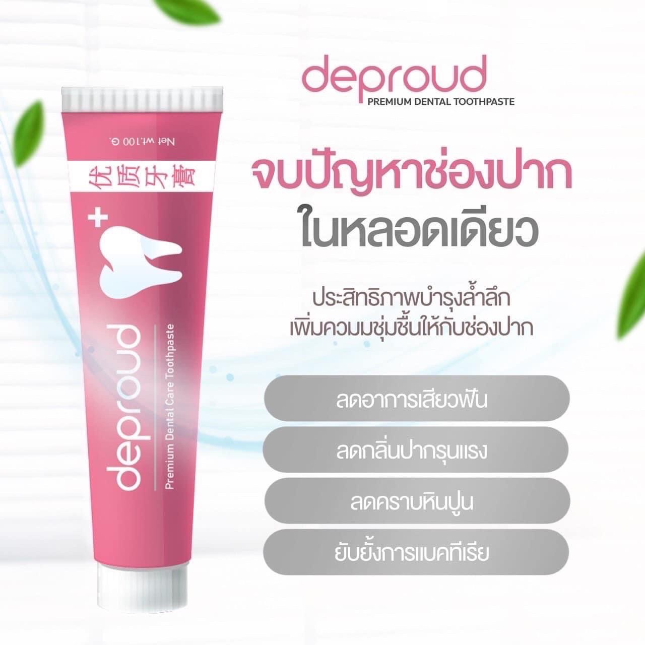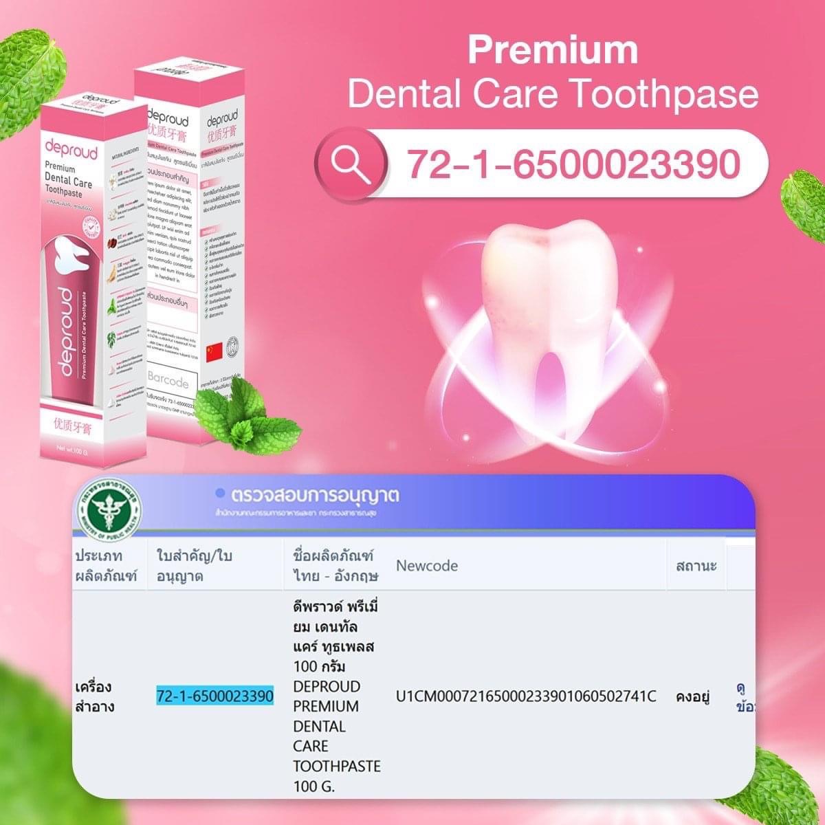 เลขที่จดแจ้ง 72-1-6500023390 ดีพราวด์ พรีเมี่ยม เดนทัล แคร์ ทูธเพลส 100 กรัม DEPROUD PREMIUM DENTAL CARE TOOTHPASTE 100 G. |