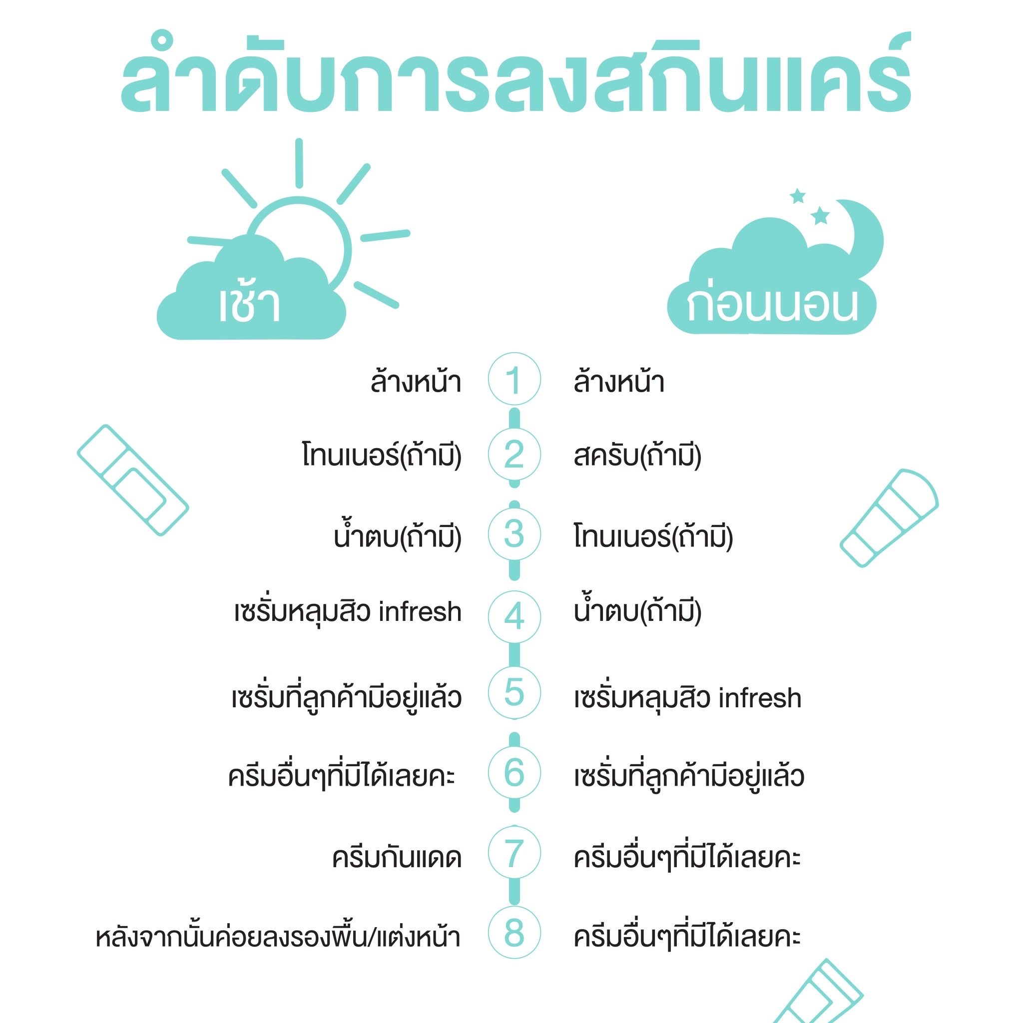 สารสกัดหลักของ อินเฟรช ไวท์เทนนิ่ง เซรั่ม INFRESH WHITENING SERUM 💧 Collaxyl : เป็น peptide สังเคราะห์ที่ได้รับการจดสิทธิบัตร โดยมีลำดับการจัดเรียงกรดอะมิโนเหมือนกับ collagen IV และ XVII จะช่วยกระบวนการซ่อมแซมผิวหนัง ทำให้ผิวหนังที่ถูกทำลายตื้นขึ้น 💧 สารสกัดหัวหอม : (Allium Cepa (Onion) Bulb Extract) จากประเทศญี่ปุ่น มีความเข้มข้นของเควอซิทิน (Quercetin) ไกลโคไซด์ (Glycoside) และกรดโปรโตคาเทคซูอิค (Protocatechuic Acid) สูงมาก ช่วยป้องกันขบวนการ Oxidation ของผิว อันเป็นสาเหตุของจุดด่างดำ และริ้วรอยก่อนวัย และยังเร่งการสร้างเนื้อเยื่อผิว 💧 ใบบัวบก : ช่วยลดสิว และสมานแผลได้เร็ว คืนความอ่อนเยาว์ให้ผิวหน้า แก้ผิวคล้ำรอบดวงตา ลดฝ้า กระ และจุดด่างดำให้หายไป 💧 วิตามินบี 3 : ลดการเกิดสิว รอยดำ และรอยแดง ลดการอุดตันของรูขุมขน ลดความมันบนใบหน้า ปรับสีผิวให้สม่ำเสมอ และกระจ่างใสขึ้น กระตุ้นเซลล์ผิวเพื่อสร้างคอลลาเจน และเซราไมล์ให้ผิว เพิ่มความชุ่มชื้นให้กับผิว ลดการอุดตันของรูขุมขน 💧 Sodium Hyaluronate : ช่วยกักเก็บน้ำ เติมความชุ่มชื้นให้ผิวอิ่มฟู พร้อมลดเลือนริ้วรอย โมเลกุลเล็กกว่า Hyaluronic Acid มาก และสามารถอุ้มน้ำได้ถึง 1000 เท่า! เสถียรกว่า และเสื่อมสภาพได้ช้ากว่า ซึมซาบเข้าสู่ผิวได้อย่างล้ำลึก ให้ผิวแลดูแข็งแรงสุขภาพดี 💧 Solanum Lycopersicum Fruit Extract : สาร Lycopene ที่พบในสารสกัดมะเขือเทศ มีสรรพคุณบำรุงผิว อุดมด้วยต้านอนุมูลอิสระ ช่วยปรับสภาพผิวให้ชุ่มชื่น กักเก็บน้ำ เรียบเนียน ลดเลือนริ้วรอย ( Anti-Oxidant) 💧 Argireline : เป็นอีกทางเลือกหนึ่ง ที่ช่วยลดริ้วรอยลึก ที่เกิดจากการเคลื่อนไหวของกล้ามเนื้อซ้ำๆ และการแสดงอารมณ์ เช่น การขมวดคิ้ว การหัวเราะ พฤติกรรมเหล่านี้ สามารถทำให้เกิดริ้วรอยได้โดยที่เราไม่รู้ตัว Argireline จะช่วยลดการหลั่งของสารสื่อประสาท ที่เกี่ยวข้องกับการควบคุมการเคลื่อนไหวของกล้ามเนื้อบนใบหน้า จึงมีผลให้สามารถป้องกันการเกิดริ้วรอยได้ สารตัวนี้พัฒนามาจากแนวความคิดที่อยากได้สารสำคัญที่มีประสิทธิภาพคล้ายคลึงกับ Botulinum toxin type A ที่ใช้ในการฉีดโบท็อกซ์ แต่มีความเป็นพิษน้อยกว่า 💧 Ceramid : บำรุงช่วยให้ผิวขาวขึ้น ลดริ้วรอยฝ้า กระ และจุดด่างดำ โดยเซราไมด์จะมีส่วนช่วยในการลดการผลิตเม็ดสีผิว ไม่ให้เกิดจุดดำที่ผิว และไม่ให้สีผิวคล้ำเสียได้ง่าย บำรุงสุขภาพผิวพื้นฐานให้แข็งแรง เป็นส่วนประกอบสำคัญในเยื่อหุ้มเซลล์ผิว ป้องกันอันตรายที่เกิดกับผิว ป้องกันการติดเชื้อโรค แบคทีเรียต่างๆ 💧 Resorcinol : เป็นสารสกัดที่พบได้ในธรรมชาติ จำพวกธัญพืช มีประสิทธิภาพในการยับยั้งกระบวนการสร้างเม็ดสี ช่วยลดการเกิดฝ้า ปรับผิวให้ขาวสว่างกระจ่างใส 💧 ALOE BARBADENSIS LEAF : สารส