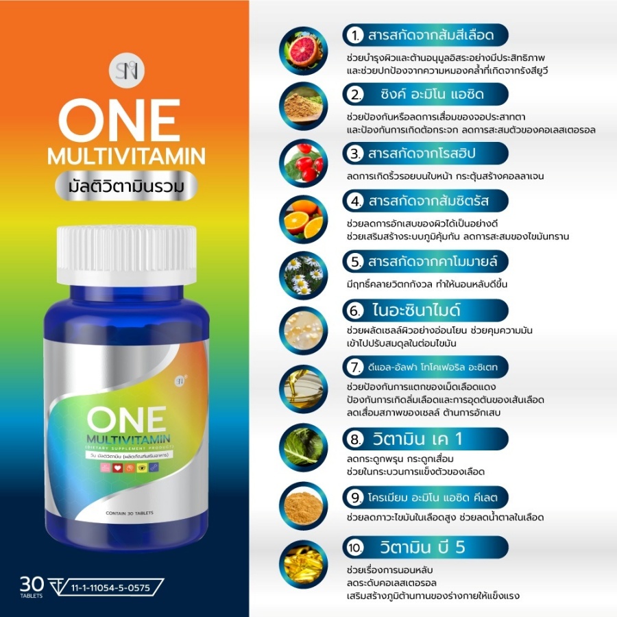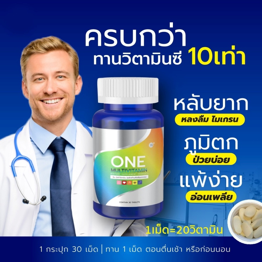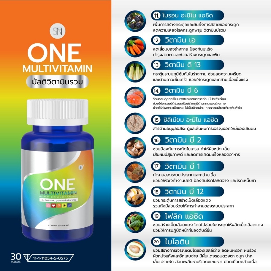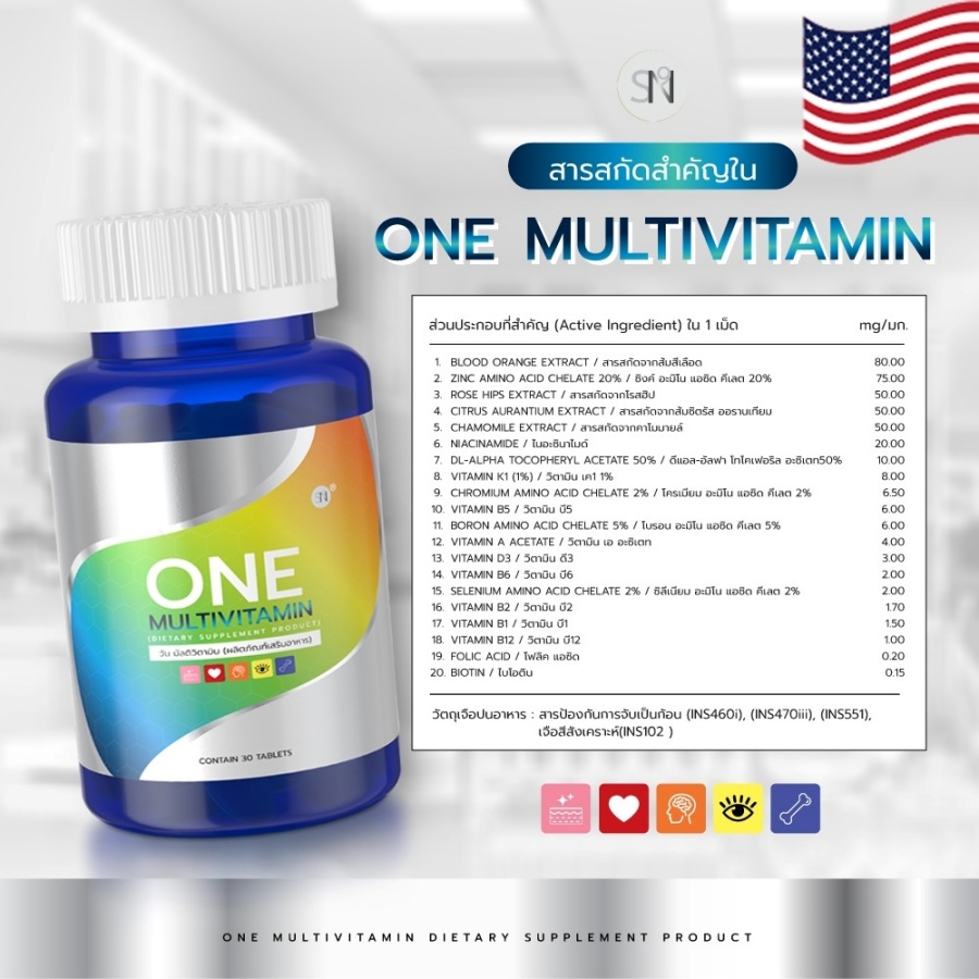 ONE MULTIVITAMN มัลติวิตามินรวม SN9 สารสกัดนำเข้าจากอเมริกาและเยอรมัน ✅ ช่วยลดอาการอ่อนเพลีย อักเสบของร่างกาย ✅ ช่วยบำรุงสมอง บำรุงปลายประสาท ✅ ช่วยบำรุงสายตา ✅ ช่วยบำรุงกระดูก ฟัน เส้นผม ✅ ช่วยฟื้นฟูผิวพรรณ ✅ ช่วยลดการสึกหรอเสื่อมของร่างกาย ✅ ช่วยลดการสะสมตัวของคอเลสเตอรอล ✅ ช่วยป้องกันโรคหัวใจ ✅ ลดกระดูกพรุน ✅ ช่วยในการแข็งตัวของเลือด |