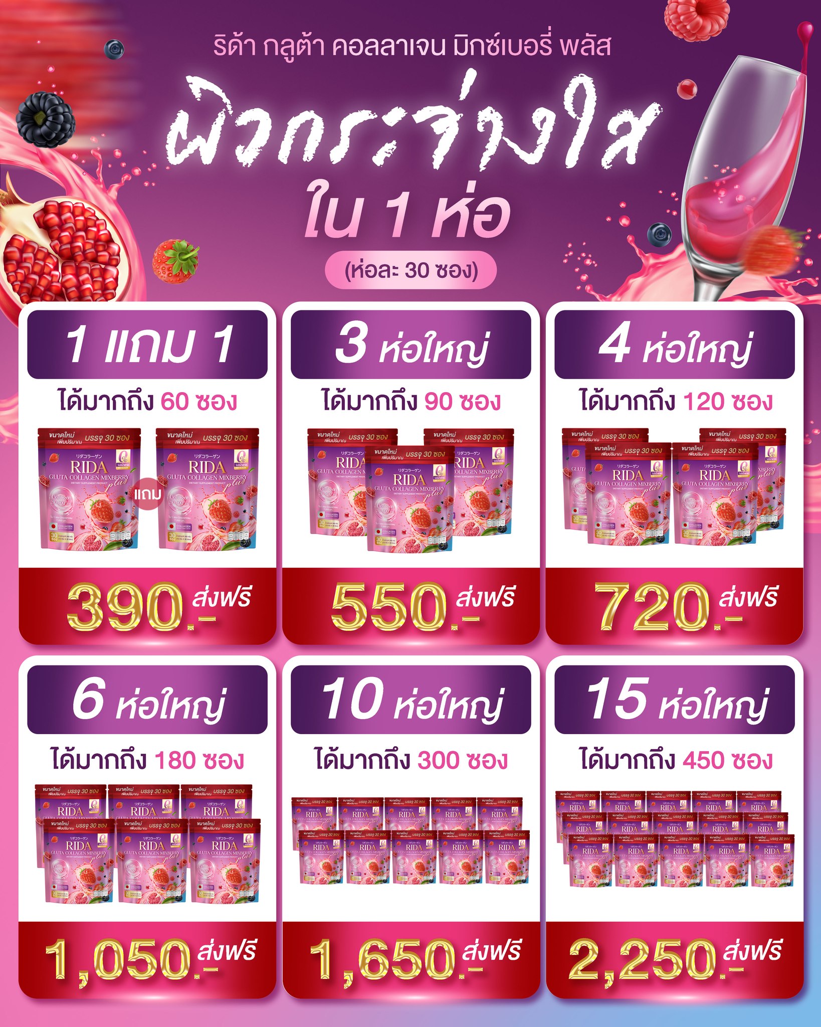 | ** โปรโมชั่นสุดพิเศษที่คุณไม่ควรพลาด! ** โปรโมชั่น Rida Gluta Collagen Mix Berry● โปร 1 แถม 1 (รวม 2 ห่อใหญ่ / 60 ซอง) ราคา 390 บาท (ส่งฟรี) ● โปร 3 ห่อใหญ่ (รวม 90 ซอง) ราคา 550 บาท (ส่งฟรี) ● โปร 4 ห่อใหญ่ (รวม 120 ซอง) ราคา 720 บาท (ส่งฟรี) ● โปร 6 ห่อใหญ่ (รวม 180 ซอง) ราคา 1,050 บาท (ส่งฟรี) ● โปร 10 ห่อใหญ่ (รวม 300 ซอง) ราคา 1,650 บาท (ส่งฟรี) ● โปร 15 ห่อใหญ่ (รวม 450 ซอง) ราคา 2,250 บาท (ส่งฟรี) |
