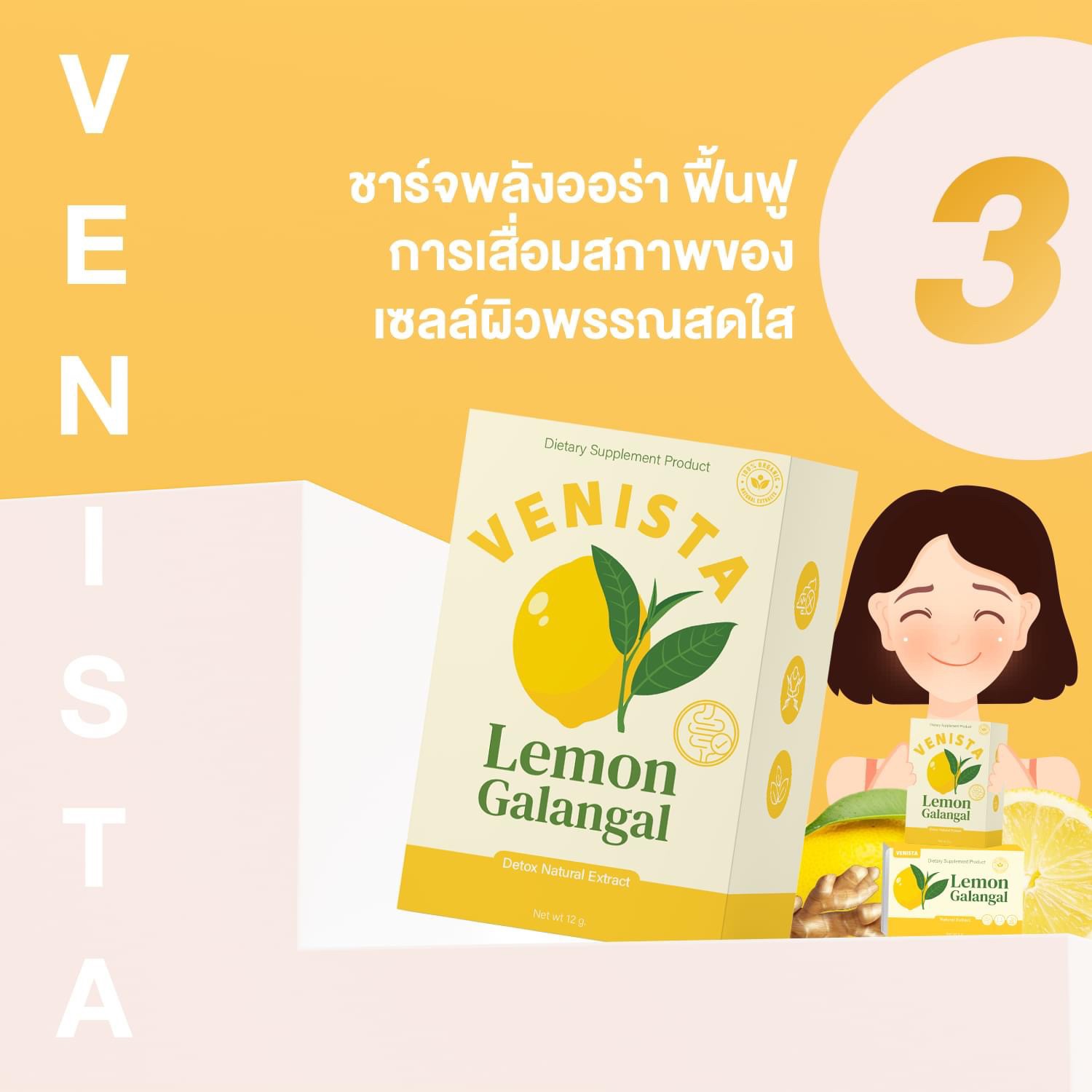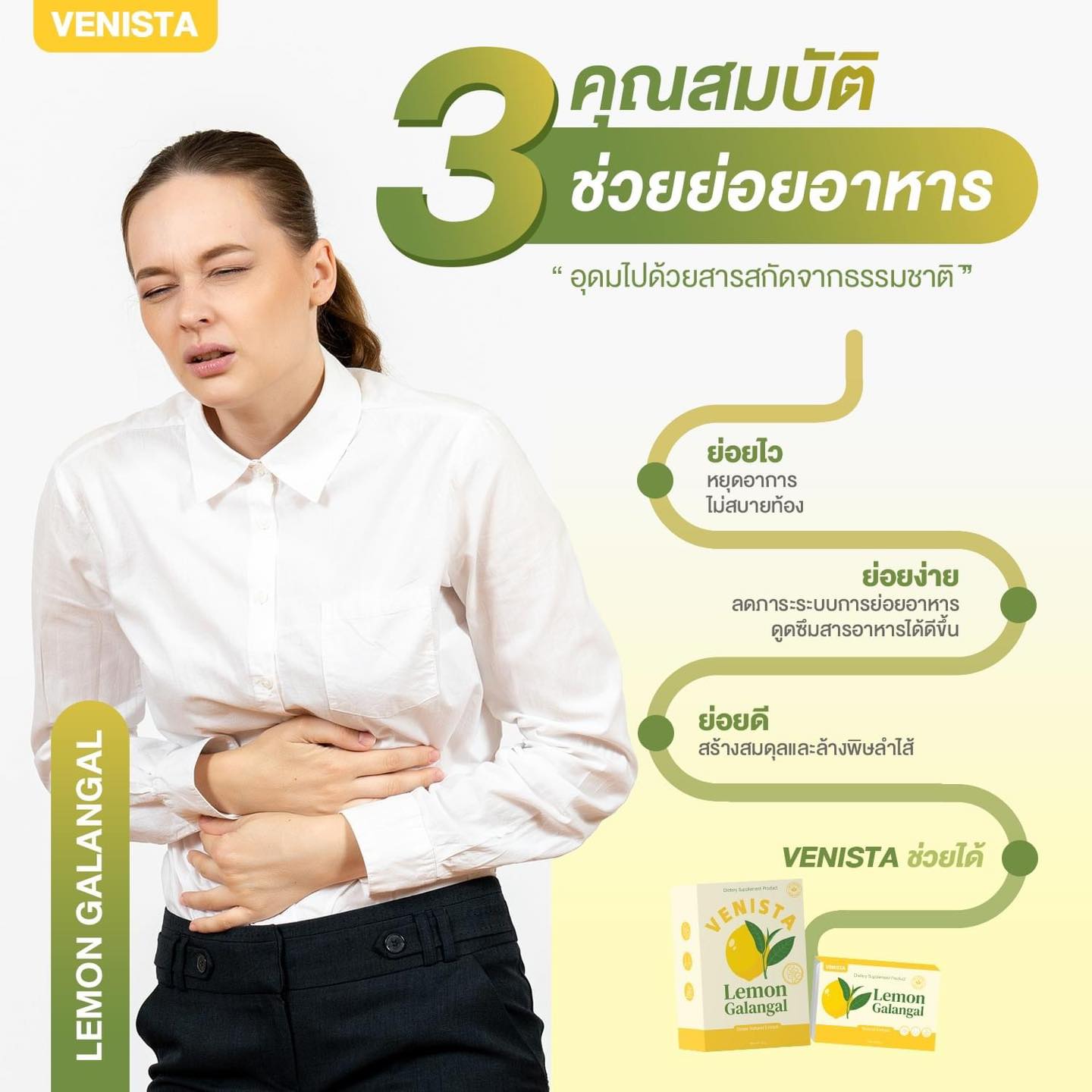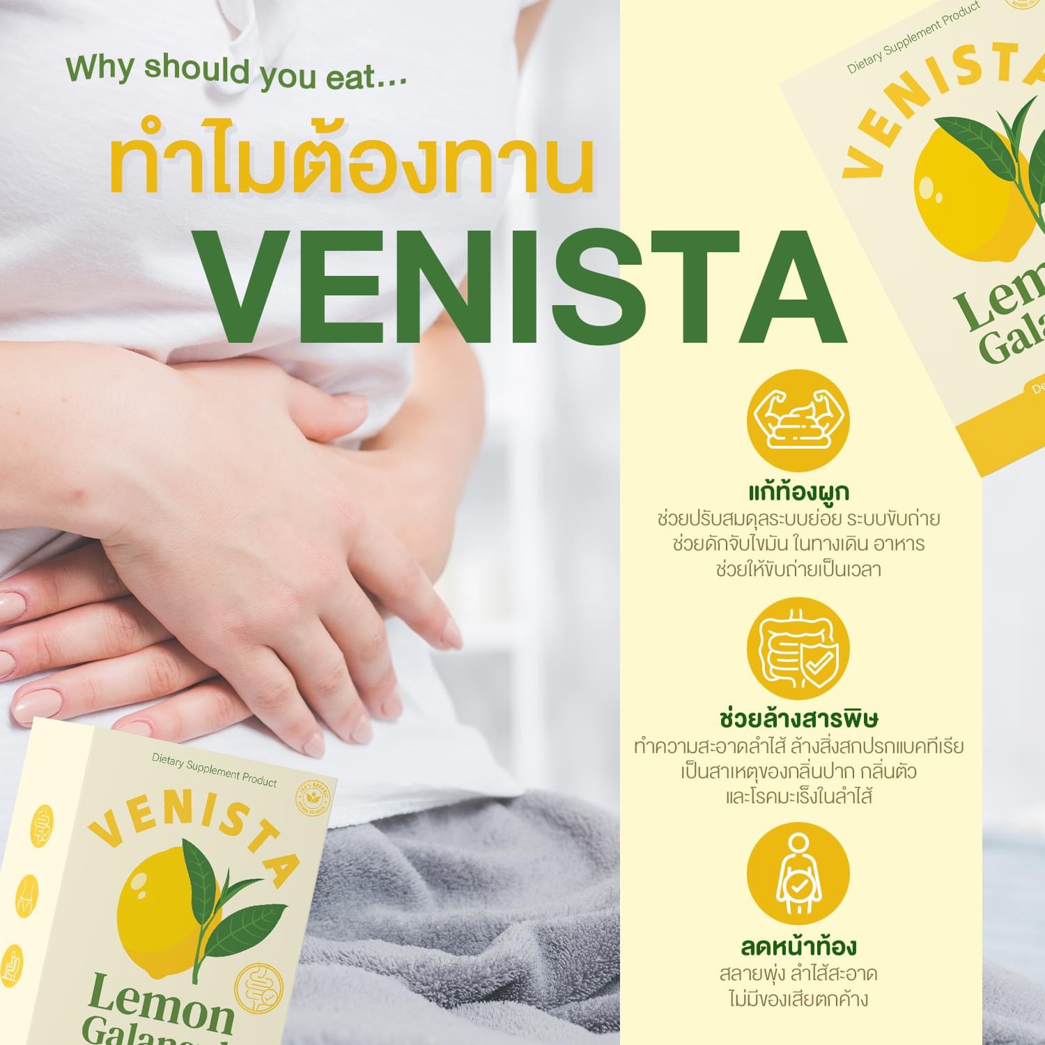 ส่วนประกอบที่สำคัญในเวนิสต้า (ผลิตภัณฑ์เสริมอาหาร) 1 เม็ด (400 มก.) - สารสกัดจากสัม 100 มก. ช่วยกระตุ้นระบบเผาผลาญอาหารที่ได้รับประทานเข้าไป - ผงข่า 70 มก. ลดการบีบตัวของลำไส้เล็ก ลดการอักเสบ และลดการบวม - สารสกัดจากชาเขียว 50 มก. ลดปริมาณไขมันและคอเลสเตอรอสในร่างกาย ป้องกันการเกิดภาวะหลอดเลือดอุดตัน - ฟรุคโตโอลิโกแชคคาไรด์ (95%) 40 มก. ช่วยปรับสมดุลในร่างกาย ล้างสารพิษในลำไส้ - โพลีเดกโตรส (90%) 40 มก. ช่วยในเรื่องของการปรับสมดุลระบบนิเวศน์ในลำไส้ การเสริมภูมิให้ลำไส้ - ไคโตชาน (90%) 30 มก. ช่วยลดคอเลสเตอรอส และไขมันในเส้นเลือด - ผงไซเลียมฮัสก์ 30 มก. ช่วยกระตุ้นการสร้างน้ำดี จึงทำให้ร่างกายมีน้ำดีเพียงพอ - อินูลิน (90%) 20 มก. ช่วยลดการดูดซึมน้ำตาลเข้าสู่ในเลือด - วิตามิน ซี 15 มก. ช่วยขยายเส้นเลือดในลำไส้และกระเพาะอาหาร ทำให้ร่างกายสามารถดูดซึมสารอาหารได้ดีขึ้น - สารป้องกันการจับเป็นก้อน (INS 470 (il))  |