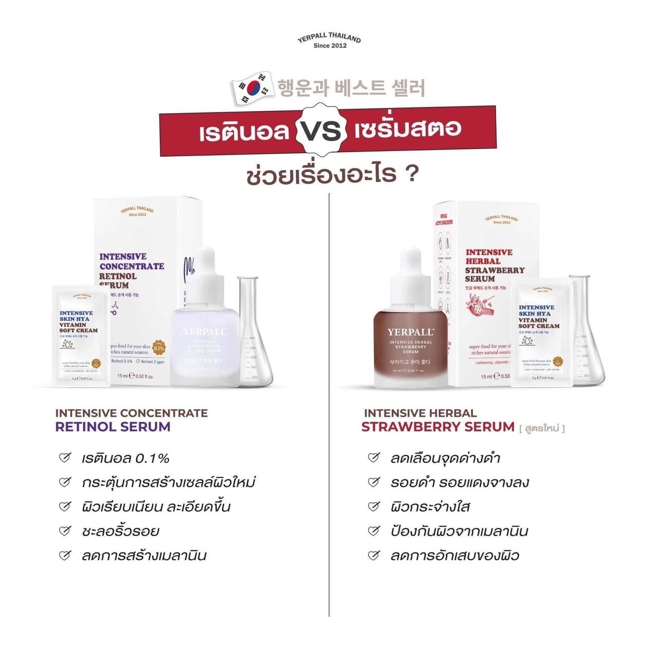 เรตินอล VS เซรั่มสตอ ช่วยเรื่องอะไร ? INTENSIVE CONCENTRATE RETINOL SERUM 💧 เรตินอล 0.1% กระตุ้นการสร้างเซลล์ผิวใหม่ ผิวเรียบเนียน ละเอียดขึ้น ชะลอริ้วรอย ลดการสร้างเมลานิน INTENSIVE HERBAL STRAWBERRY SERUM (สูตรใหม่) 🍓 ลดเลือนจุดด่างดำ รอยดำ รอยแดงจางลง ผิวกระจ่างใส ป้องกันผิวจากเมลานิน ลดการอักเสบของผิว |
