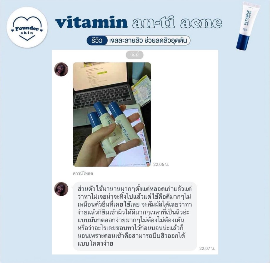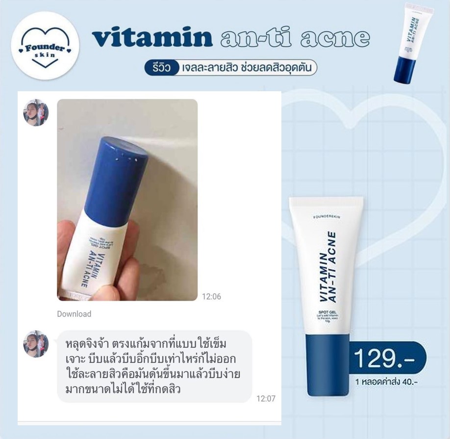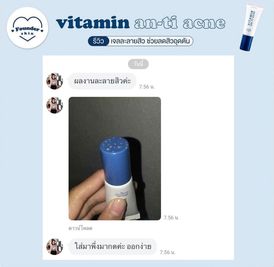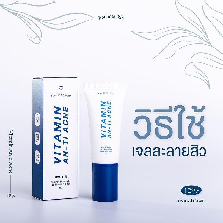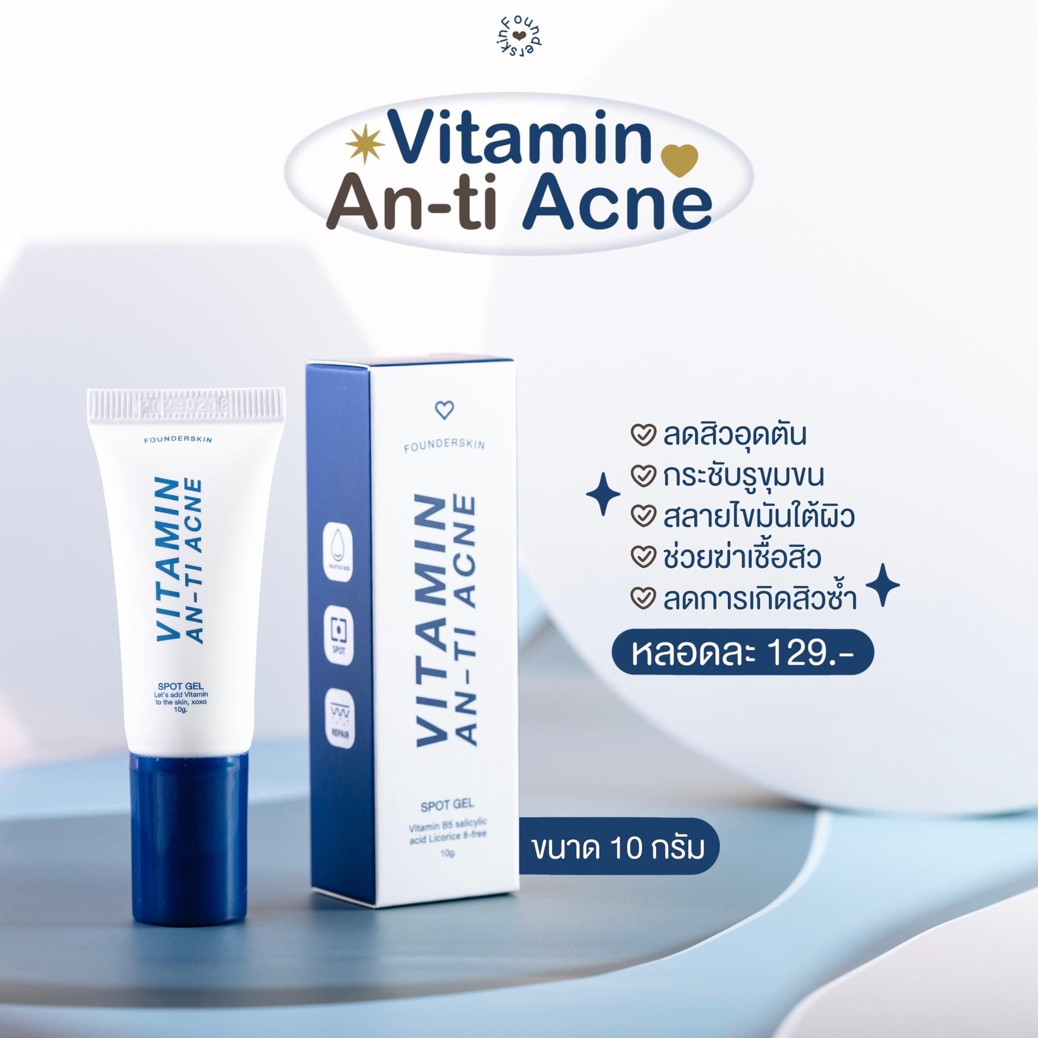 เจลละลายสิวฟาวเดอร์ Founderskin Vitamin An-ti Acne น้องละลายสิวตัวดัง ตัวโดน ใช้แล้วสิวหลุดจริงไม่ติงนัง หลอดเดียวใช้ได้นาน 1 เดือน สิวหายด้วยงบหลักร้อย ช่วยฆ่าเชื้อสิว ตัดวงจรสิว ลดสิวทุกชนิด สิวแห้งเร็วมาก ละลายไขมันใต้ผิวหนังสาเหตุที่เกิดสิว 1 หลอด ขนาด 10 กรัม  |