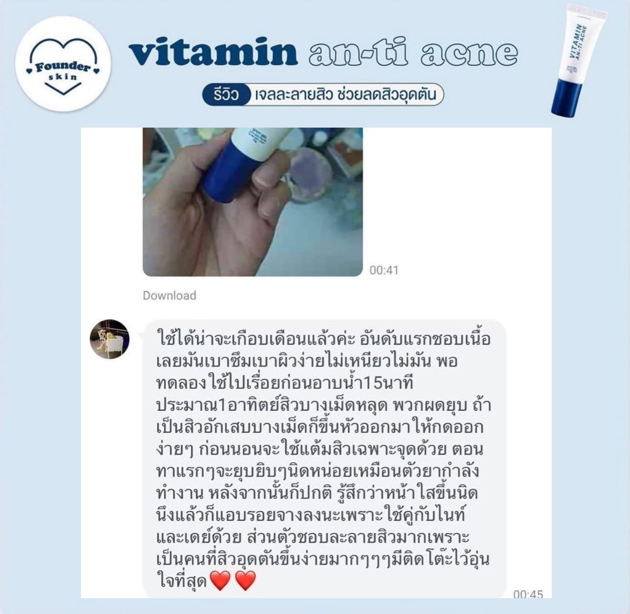 เจลละลายสิวฟาวเดอร์ Founderskin Vitamin An-ti Acne ช่วยเรื่องอะไรบ้าง? 💙 ลด ละลายสิวอุดตัน 💙 ดีท็อกสิ่งสกปรกในรูขุมขน จึงทำให้รูขุมขนกระชับขึ้น 💙 ละลายไขมันใต้ผิว ละลายหัวสิวปิดใต้ผิว 💙 ช่วยฆ่าเชื้อสิว ลดการอักเสบ 💙 ลดการเกิดสิวซ้ำ 💙 ผิวบอบบางใช้ได้ 💙 ไม่มี 8 สารอันตรายกับผิว  |