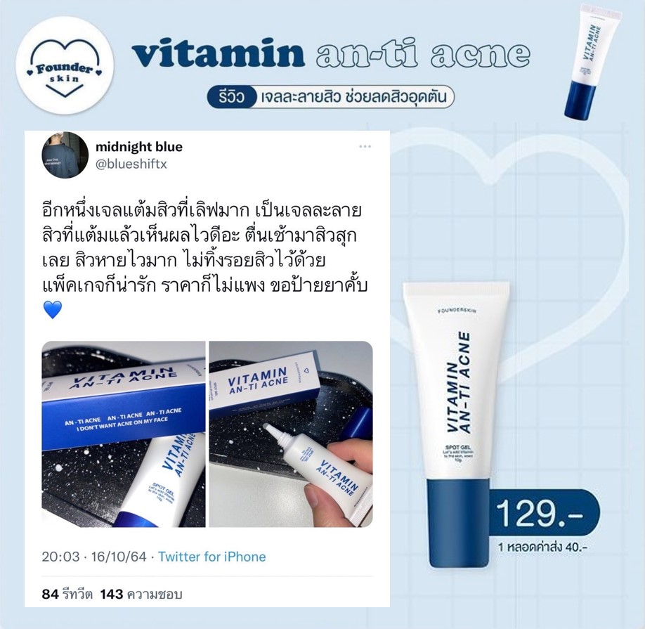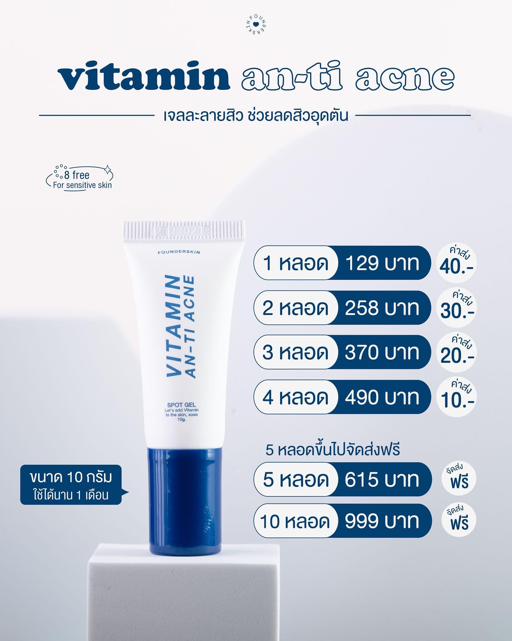 Founderskin Vitamin An-ti Acne ประกาศเตือน! สินค้าที่ราคาต่ำกว่า 129 บาท "เป็นของปลอม" มีลูกค้าได้รับความเสียหายจำนวนมาก ทางแบรนด์ๆขอไม่มีส่วนรับผิดชอบใดๆ กับการซื้อของต่ำกว่าราคา  |